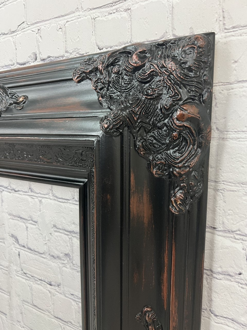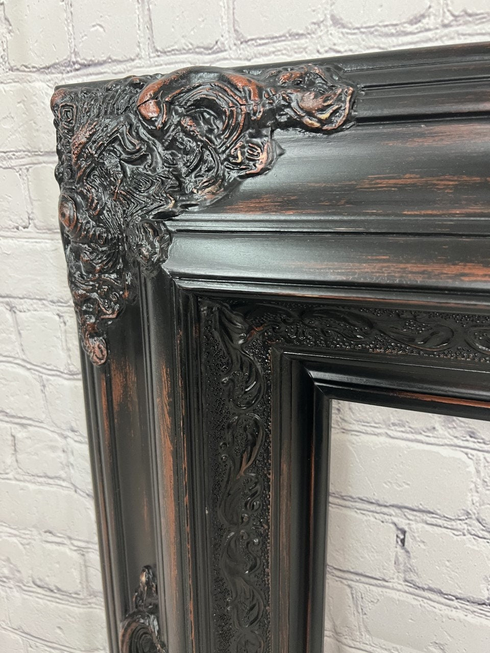 Extra wide baroque style picture frame. This beautiful frame is solid wood with large decorative ornates. It is hand painted with a maple color base tone and finished with a distressed black look. Each frame is uniquely hand crafted and detailed with a worn vintage appeal. It is perfect for colonial vintage decor, shabby chic, and antique style decor. Works great with any photo, art work, and mirrors.
