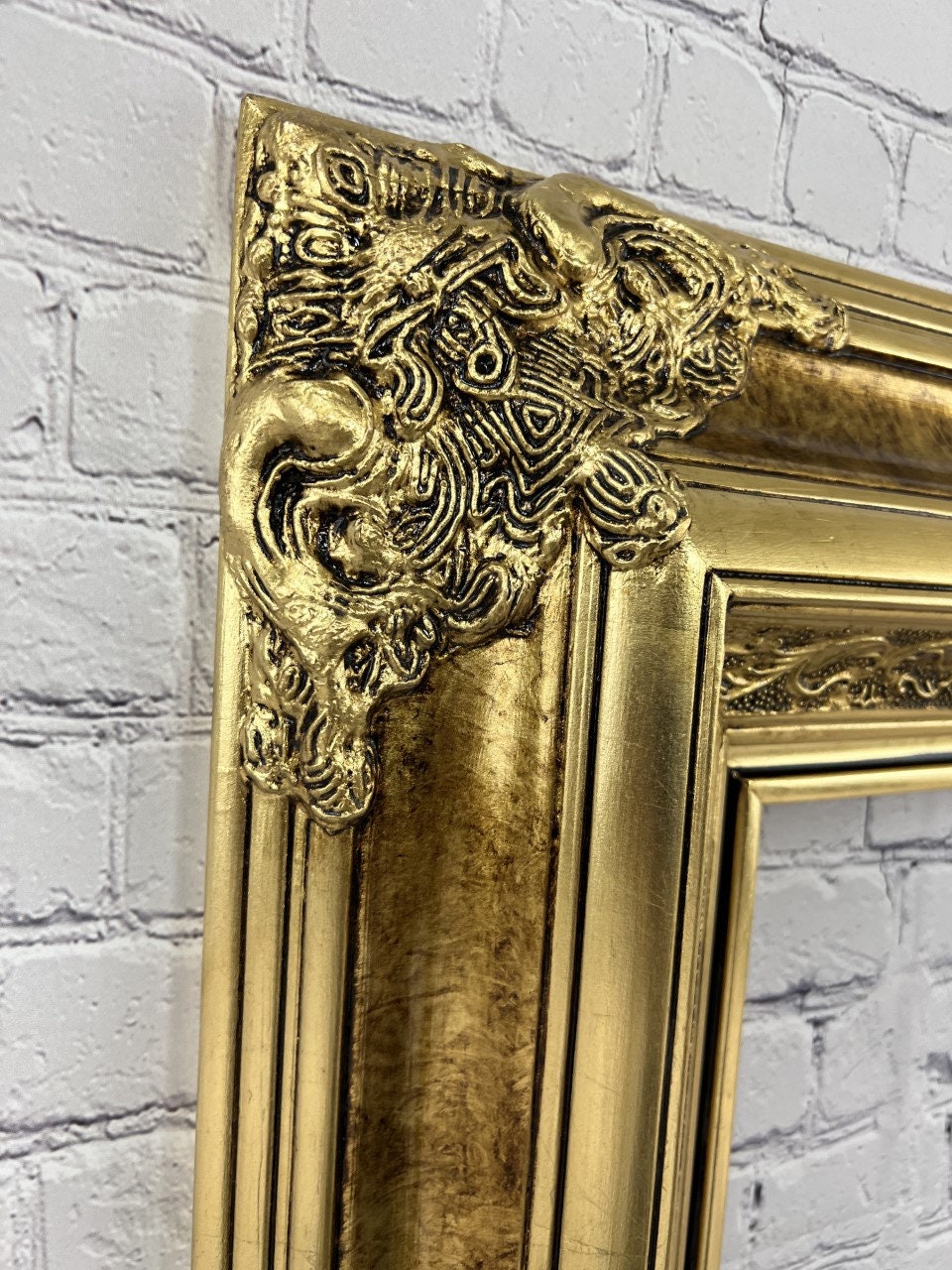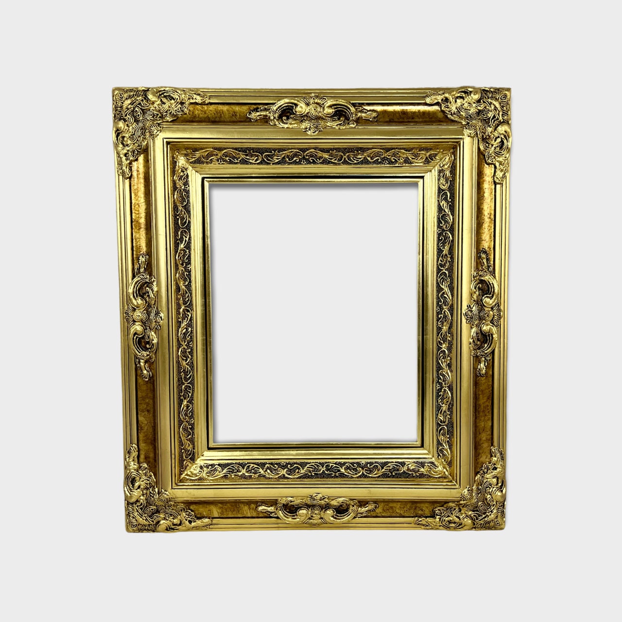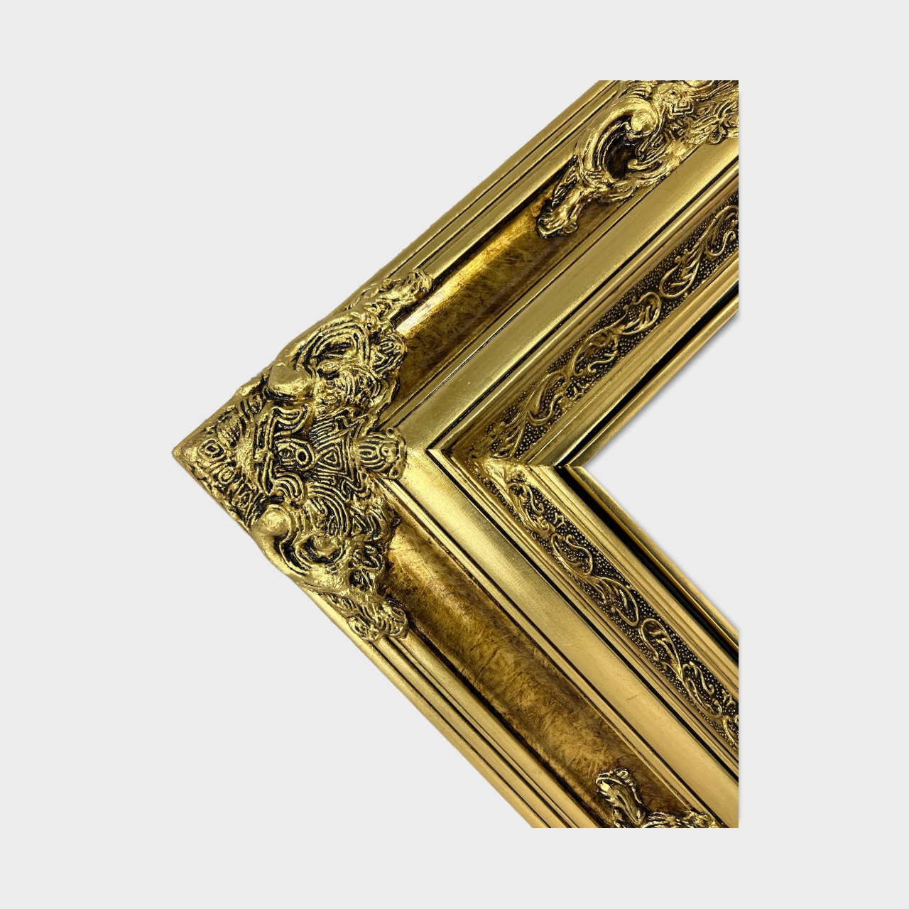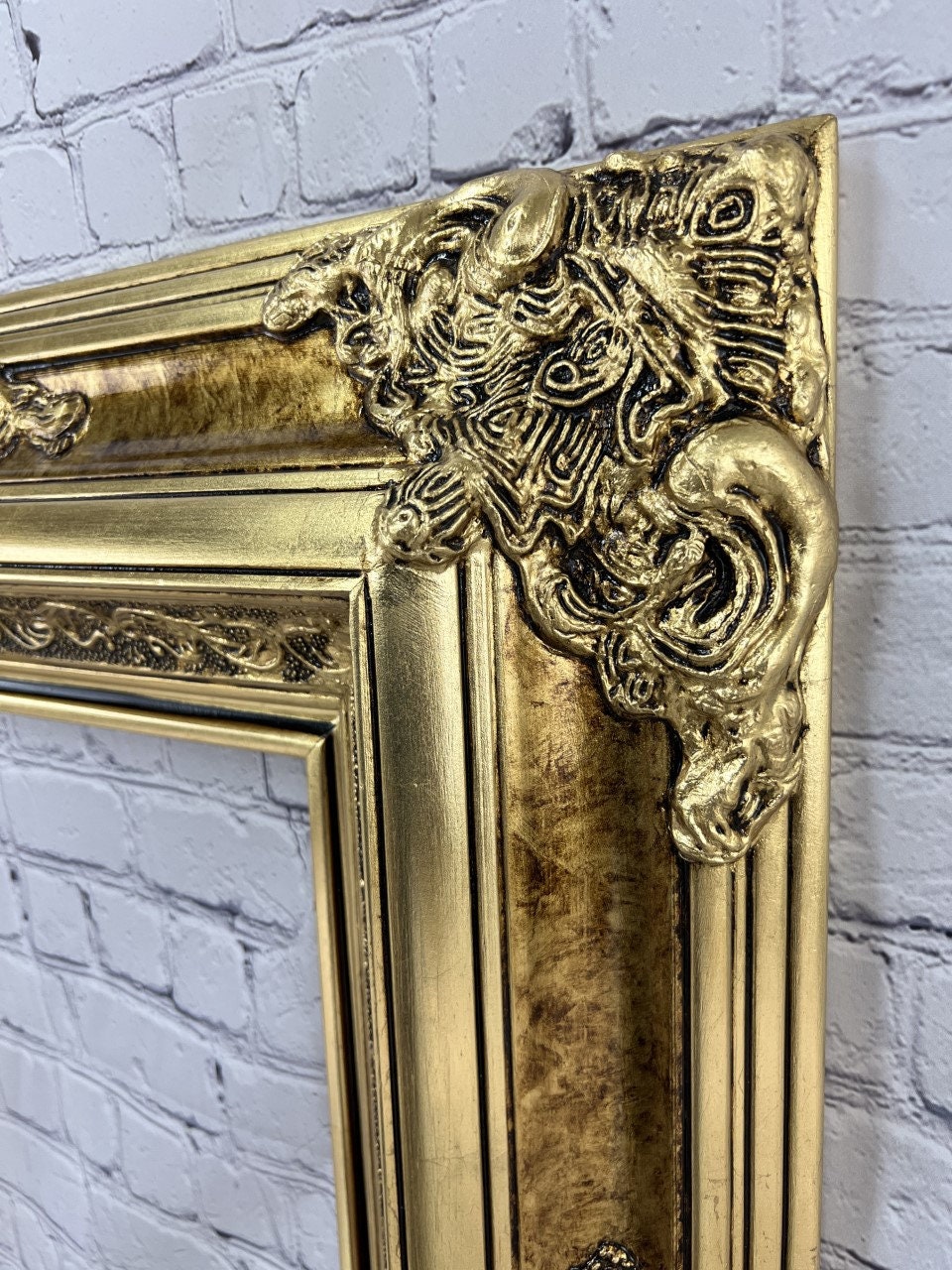 EXTRA WIDE BAROQUE STYLE FRAME. THIS FRAME IS MADE FROM SOLID WOOD WITH LEAF LIKE COMPO ORNATE DECORATIONS. HAND GUILDED METAL LEAF IS APPLIED TO THE COMPLETE FRAME AND FINISHED WITH A UNIQUE PATINA MARBLE STAIN.