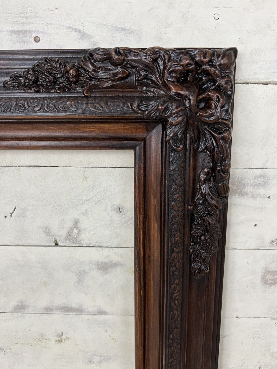 TRADITONAL WOOD PICTURE FRAME WITH XL COMPO ORNATE CORNERS. THESE ARE TWO PIECE SOLID WOOD FRAMES WITH AN ENGRAVED TRIM AND DECORATIVE FLORAL CORNERS. ALL OF OUR PICTURE FRAMES ARE ASSEMBLED WITH CLOSED CORNERS. WE CUT, JOIN, SAND, AND FINISH IN MANY UNIQUE TECHNIQUES.