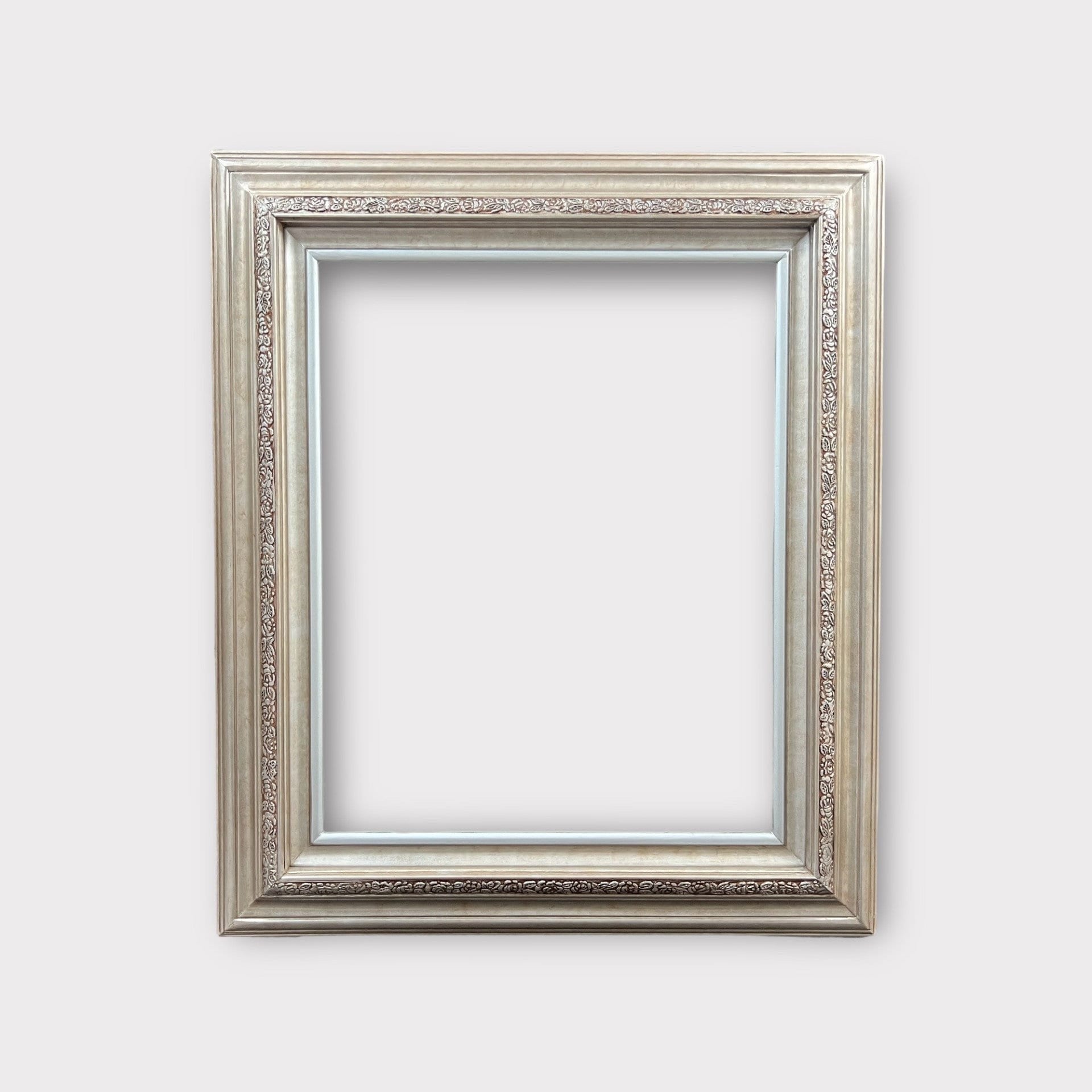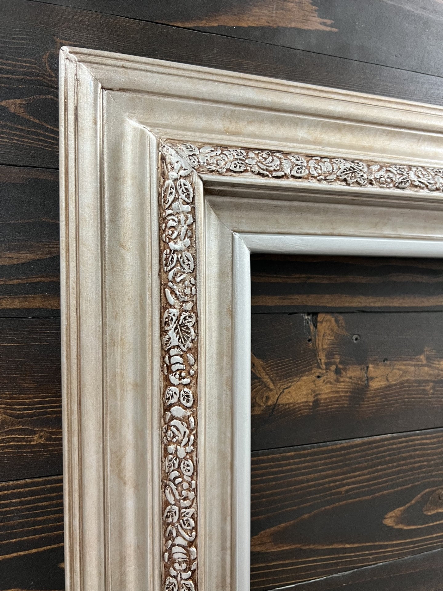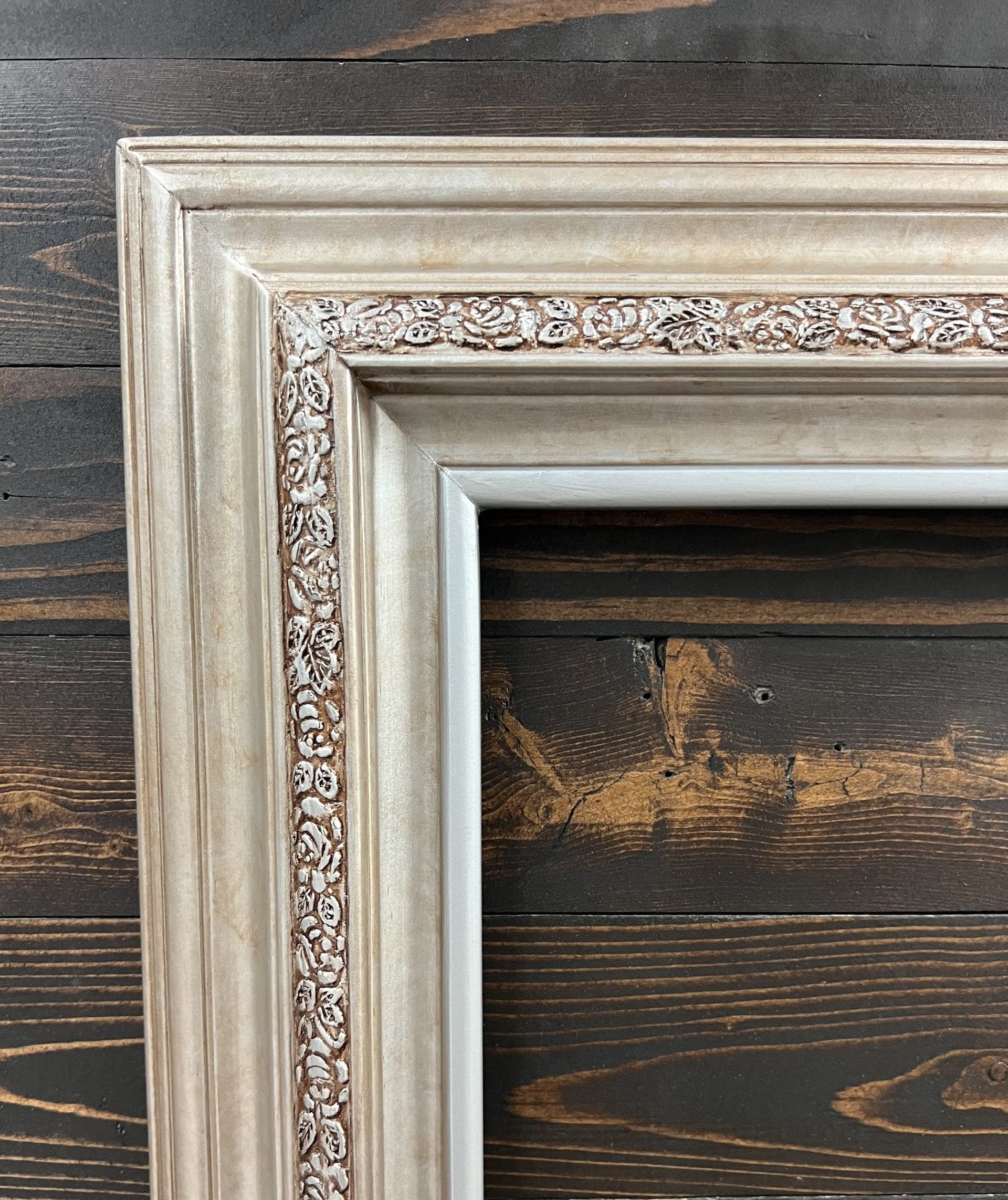 TRADITONAL VINTAGE STYLE FRAME WITH ENGRAVED FLORAL PATTERN TRIM.