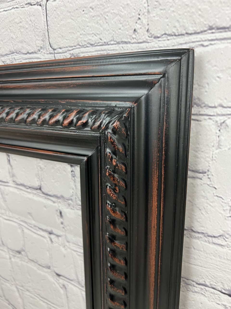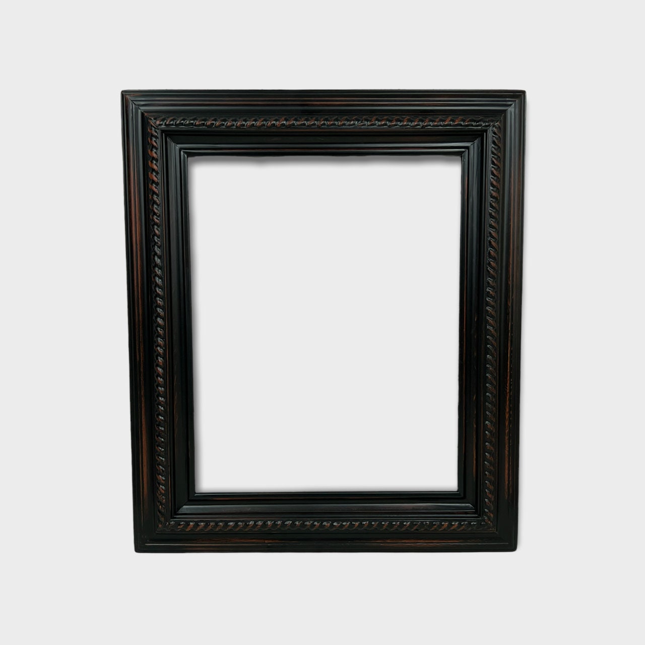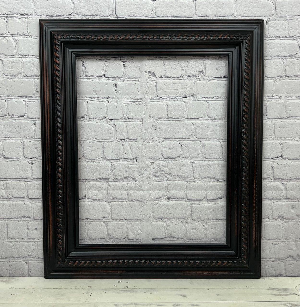 Vintage style wood picture frame with compo ornate trims. This is a solid wood frame with a rope pattern ornate trim in raised relief detail. It is finished with a distressed black finish for a time worn effect.