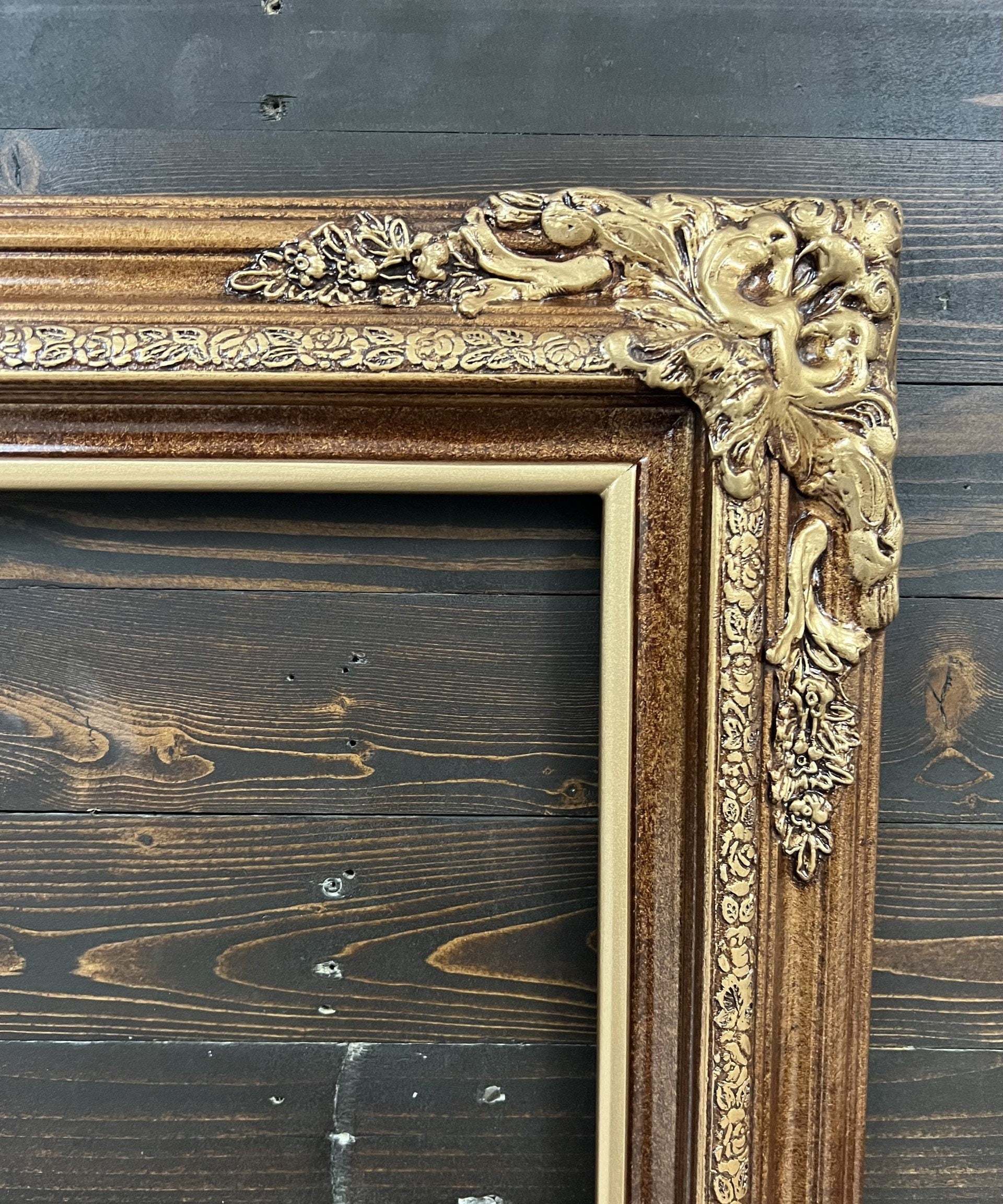 TRADITONAL WOOD PICTURE FRAME WITH EXTRA LARGE COMPO ORNATE CORNERS. THESE ARE TWO PIECE SOLID WOOD FRAMES WITH AN ENGRAVED TRIM AND OVER SIZE DECORATIVE FLORAL CORNERS. ALL OF OUR PICTURE FRAMES ARE ASSEMBLED WITH CLOSED CORNERS. WE CUT, JOIN, SAND, AND FINISH IN MANY UNIQUE TECHNIQUES.