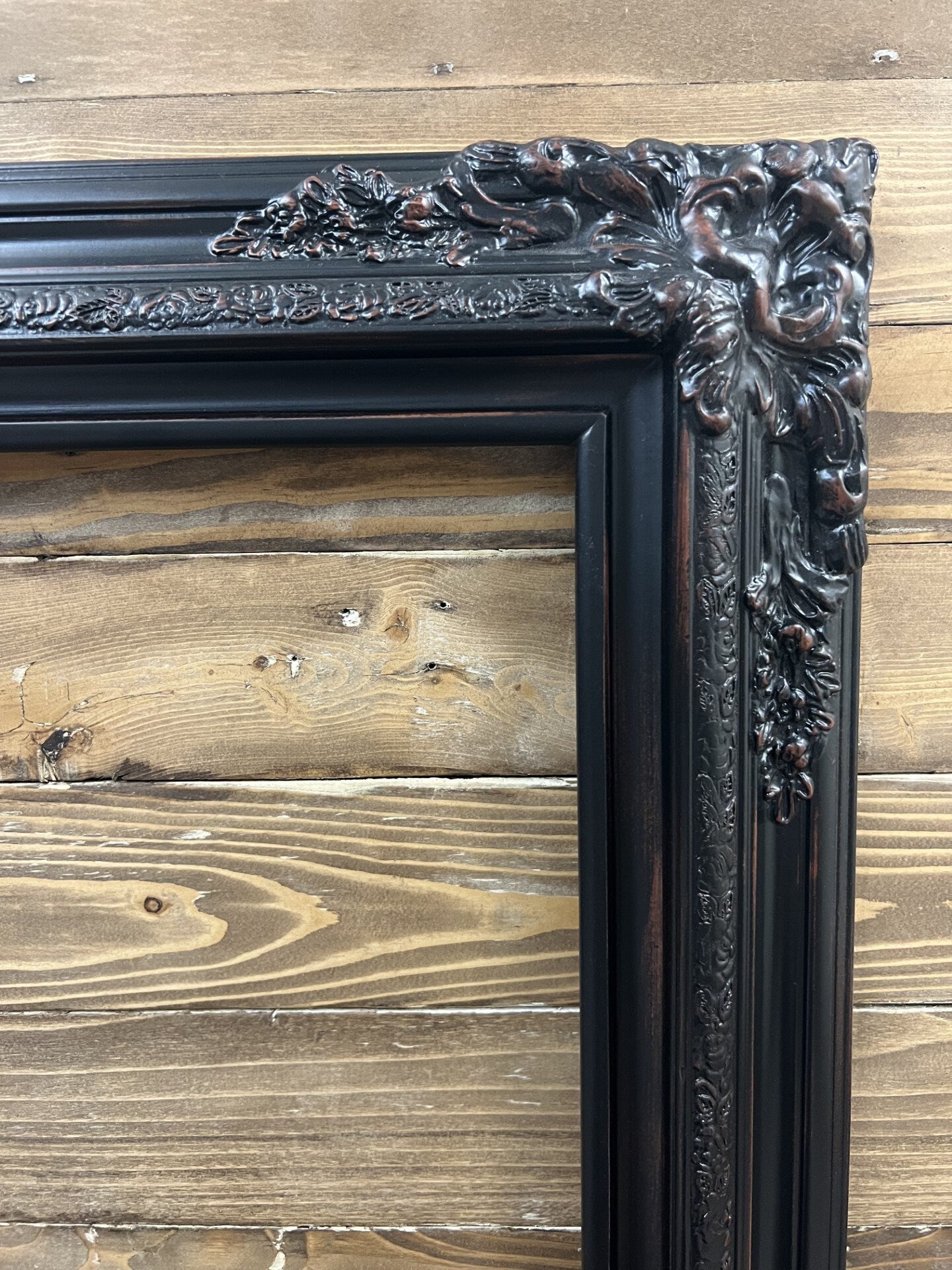 TRADITONAL WOOD PICTURE FRAME WITH XL COMPO ORNATE CORNERS. THESE ARE TWO PIECE SOLID WOOD FRAMES WITH AN ENGRAVED TRIM AND DECORATIVE FLORAL CORNERS. ALL OF OUR PICTURE FRAMES ARE ASSEMBLED WITH CLOSED CORNERS. WE CUT, JOIN, SAND, AND FINISH IN MANY UNIQUE TECHNIQUES.