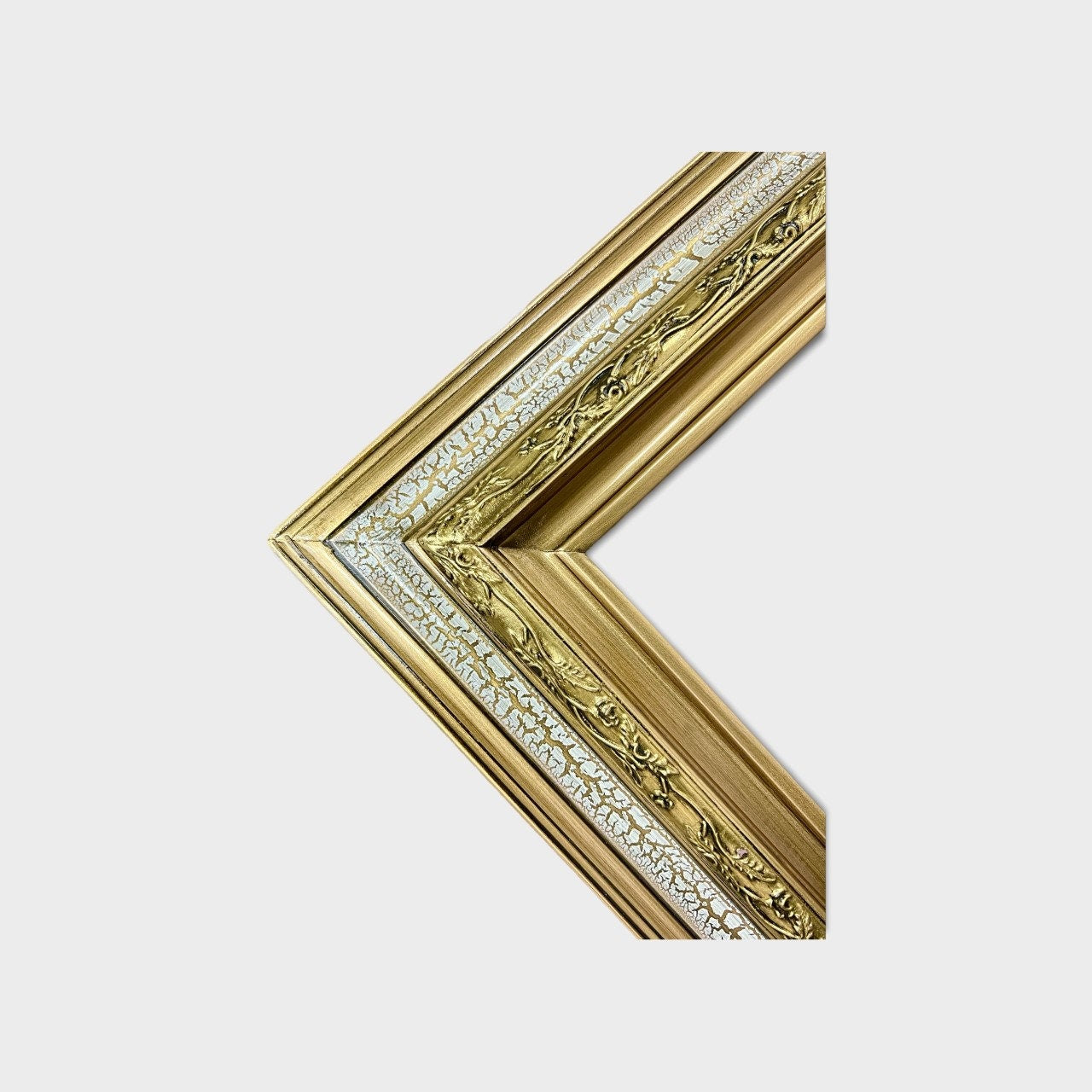 THIS FRAME HAS A GOLD TONE BASE AND FINISHED WITH A HAND DISTRESSED CRACKLE FINISH. GOLD METAL LEAF IS HAND GUILDED TO THE DECORATIVE TRIM.