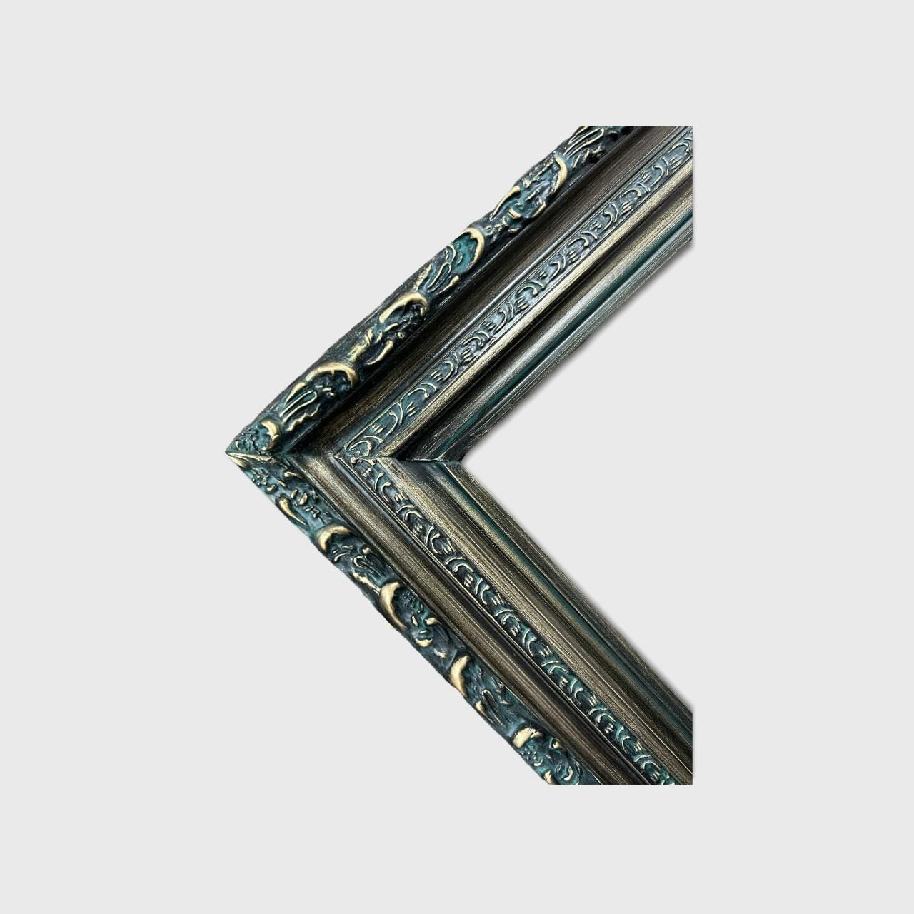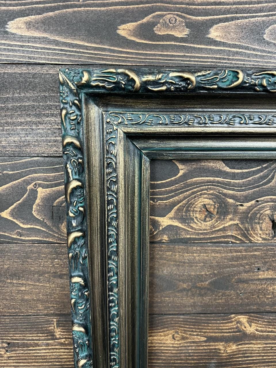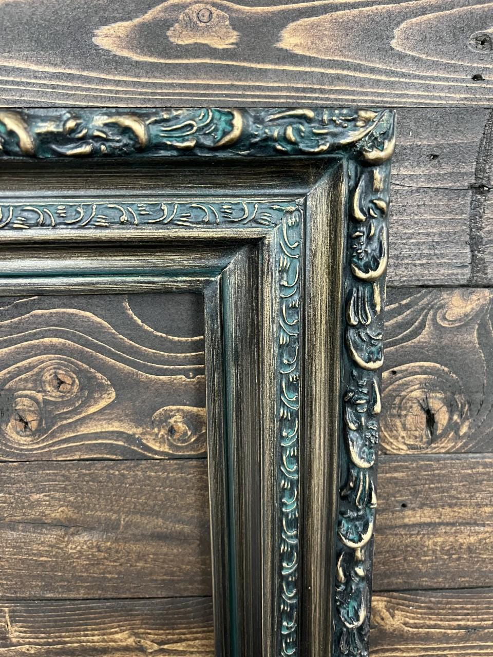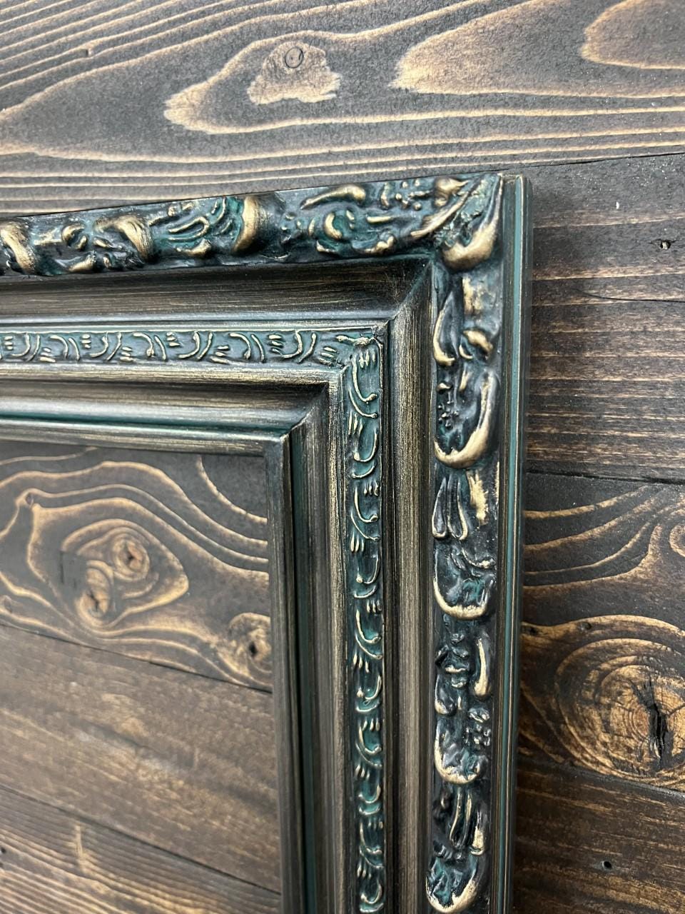 THIS FRAME IS HAND PAINTED WITH A GOLD BASE AND FINISHED WITH DISTRESSED BRONZE/GREEN TONES FOR A TIME WORN APPEAL.