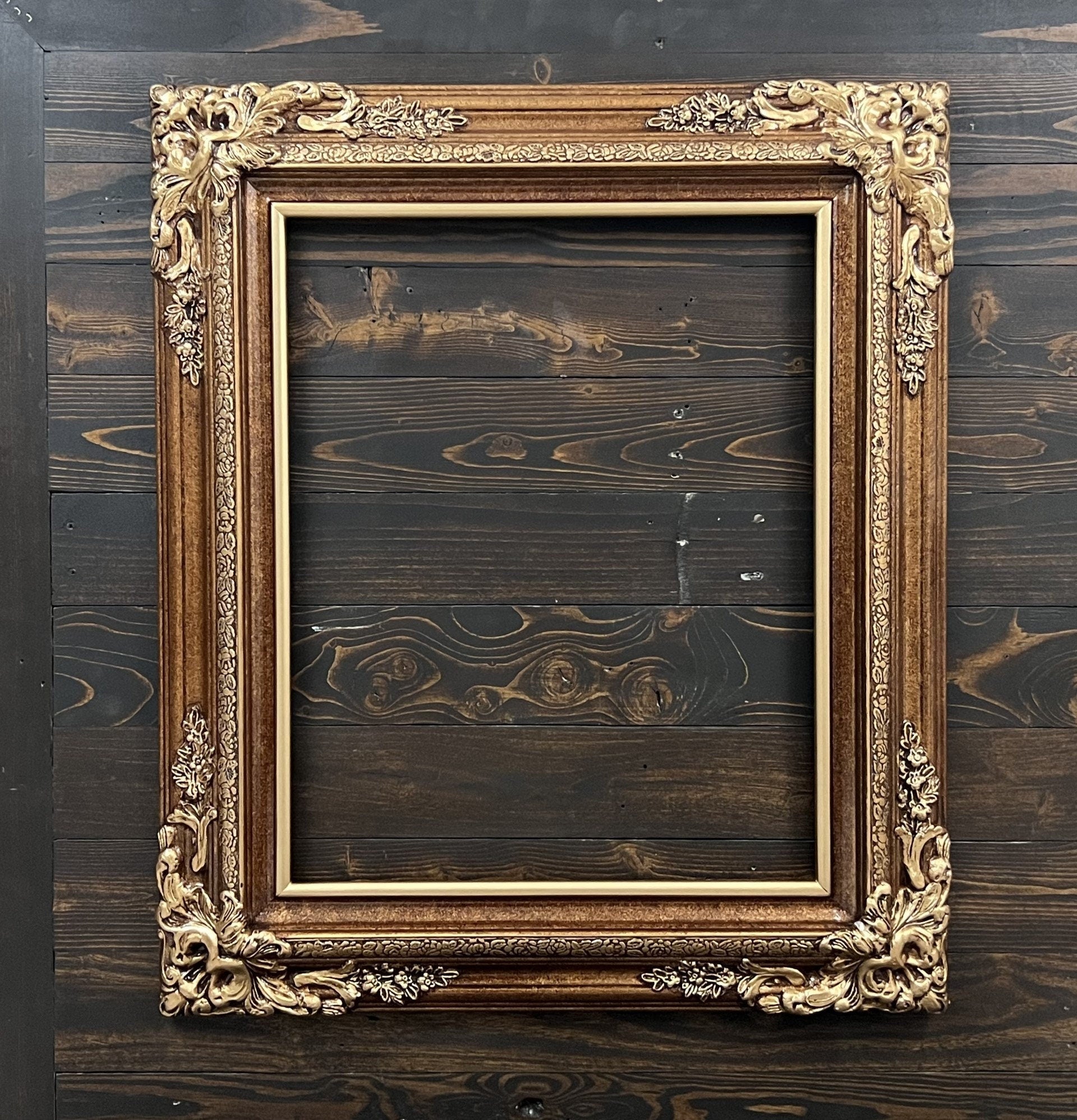 TRADITONAL WOOD PICTURE FRAME WITH EXTRA LARGE COMPO ORNATE CORNERS. THESE ARE TWO PIECE SOLID WOOD FRAMES WITH AN ENGRAVED TRIM AND OVER SIZE DECORATIVE FLORAL CORNERS. ALL OF OUR PICTURE FRAMES ARE ASSEMBLED WITH CLOSED CORNERS. WE CUT, JOIN, SAND, AND FINISH IN MANY UNIQUE TECHNIQUES.