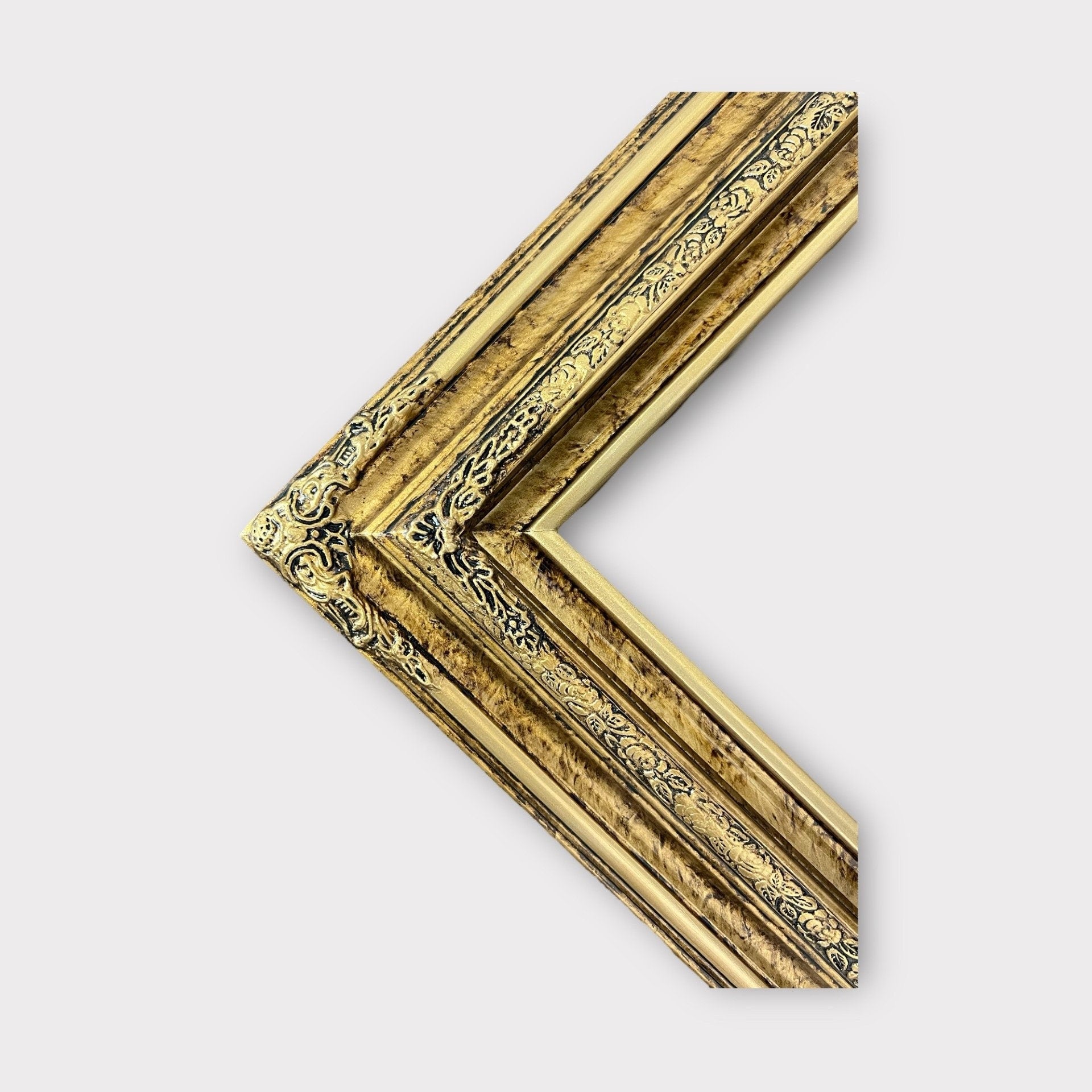 TRADITONAL WOOD PICTURE FRAME WITH COMPO ORNATE CORNERS. THESE ARE TWO PIECE SOLID WOOD FRAMES WITH AN ENGRAVED TRIM AND DECORATIVE FLORAL CORNERS. ALL OF OUR PICTURE FRAMES ARE ASSEMBLED WITH CLOSED CORNERS. WE CUT, JOIN, SAND, AND FINISH IN MANY UNIQUE TECHNIQUES.
