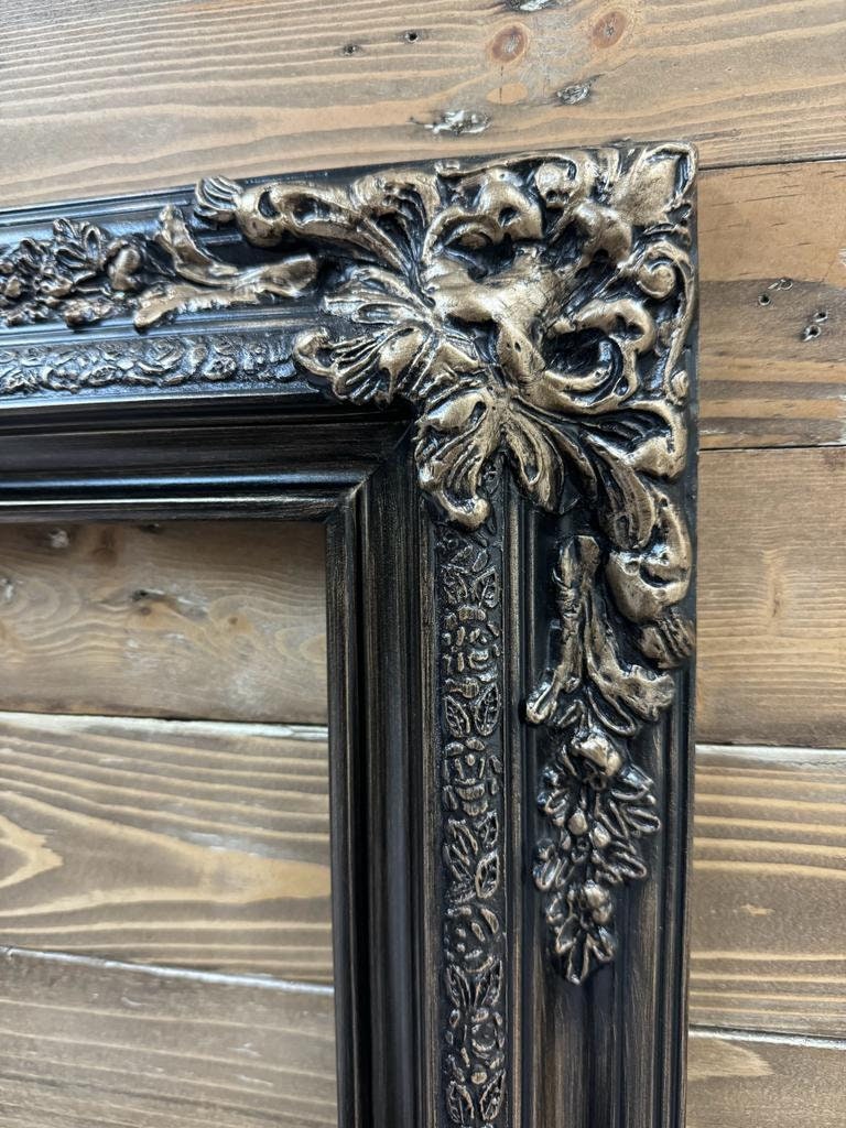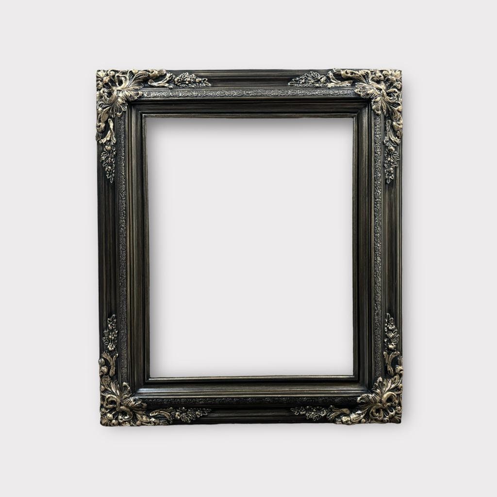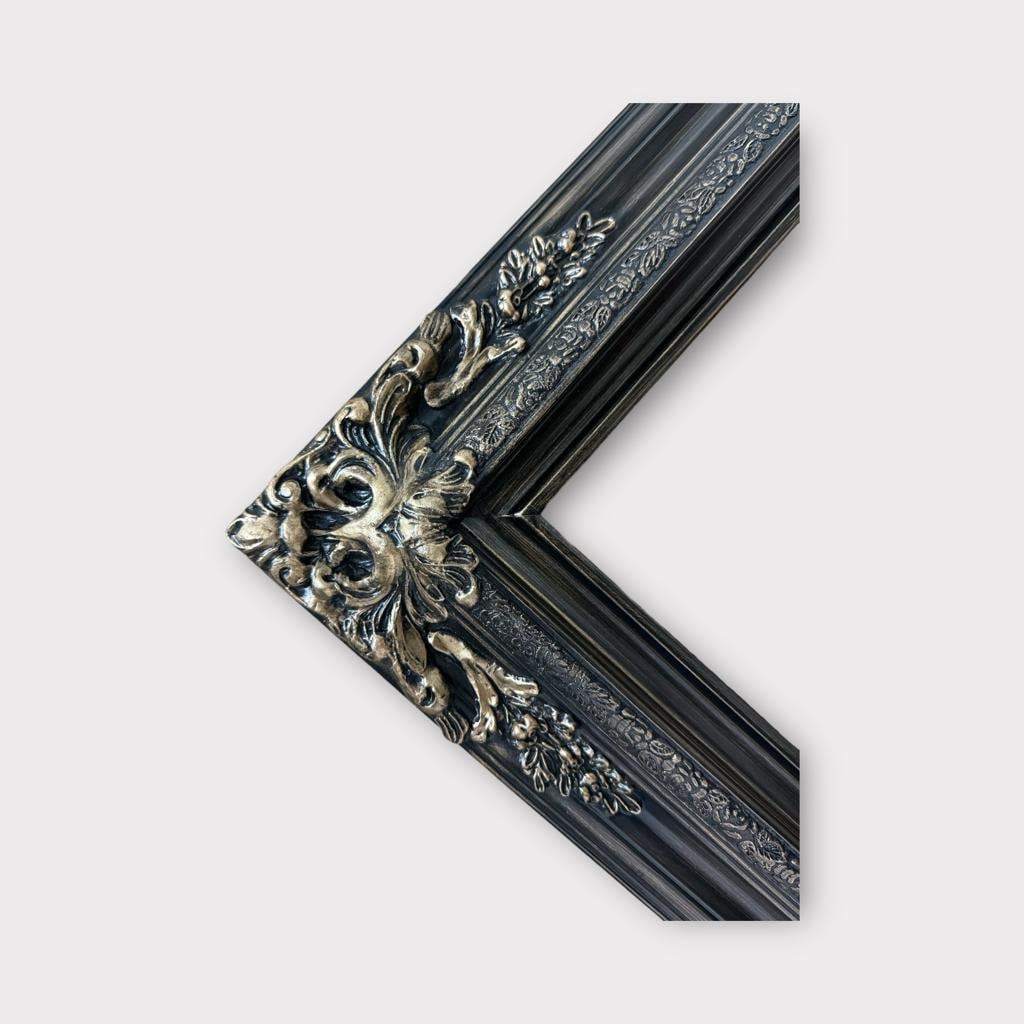 TRADITIONAL WOOD PICTURE FRAME WITH XL COMPO ORNATE CORNERS. THESE ARE TWO PIECE SOLID WOOD FRAMES WITH AN ENGRAVED TRIM AND DECORATIVE FLORAL CORNERS. ALL OF OUR PICTURE FRAMES ARE ASSEMBLED WITH CLOSED CORNERS. WE CUT, JOIN, SAND, AND FINISH IN MANY UNIQUE TECHNIQUES.