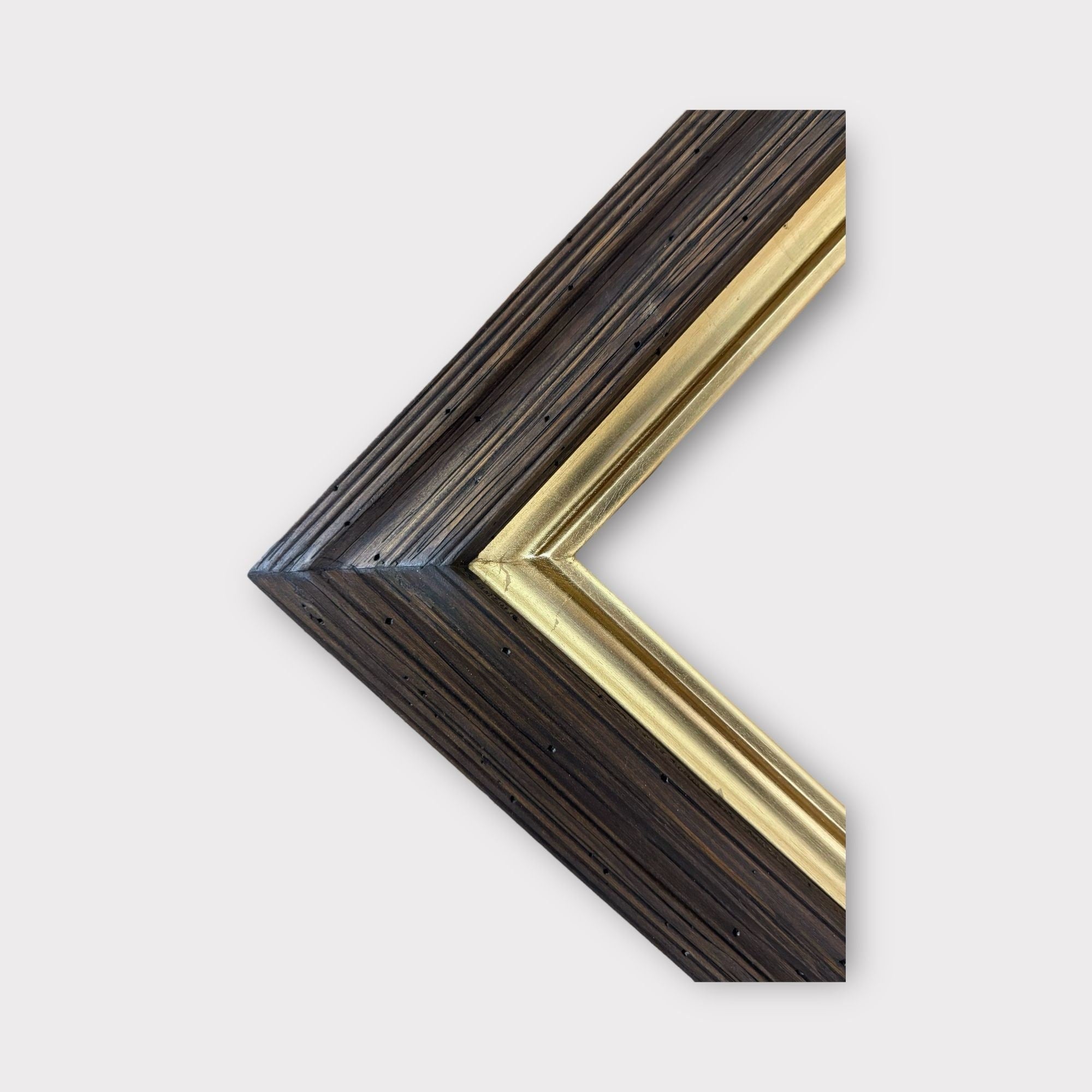 This two piece solid wood frame is distressed with a timeworn appeal. Hand stained with a reclaimed wood style finish and hand gilded gold leaf liner.