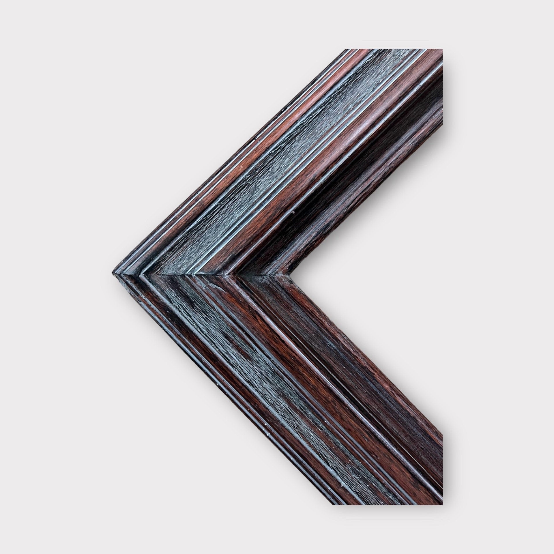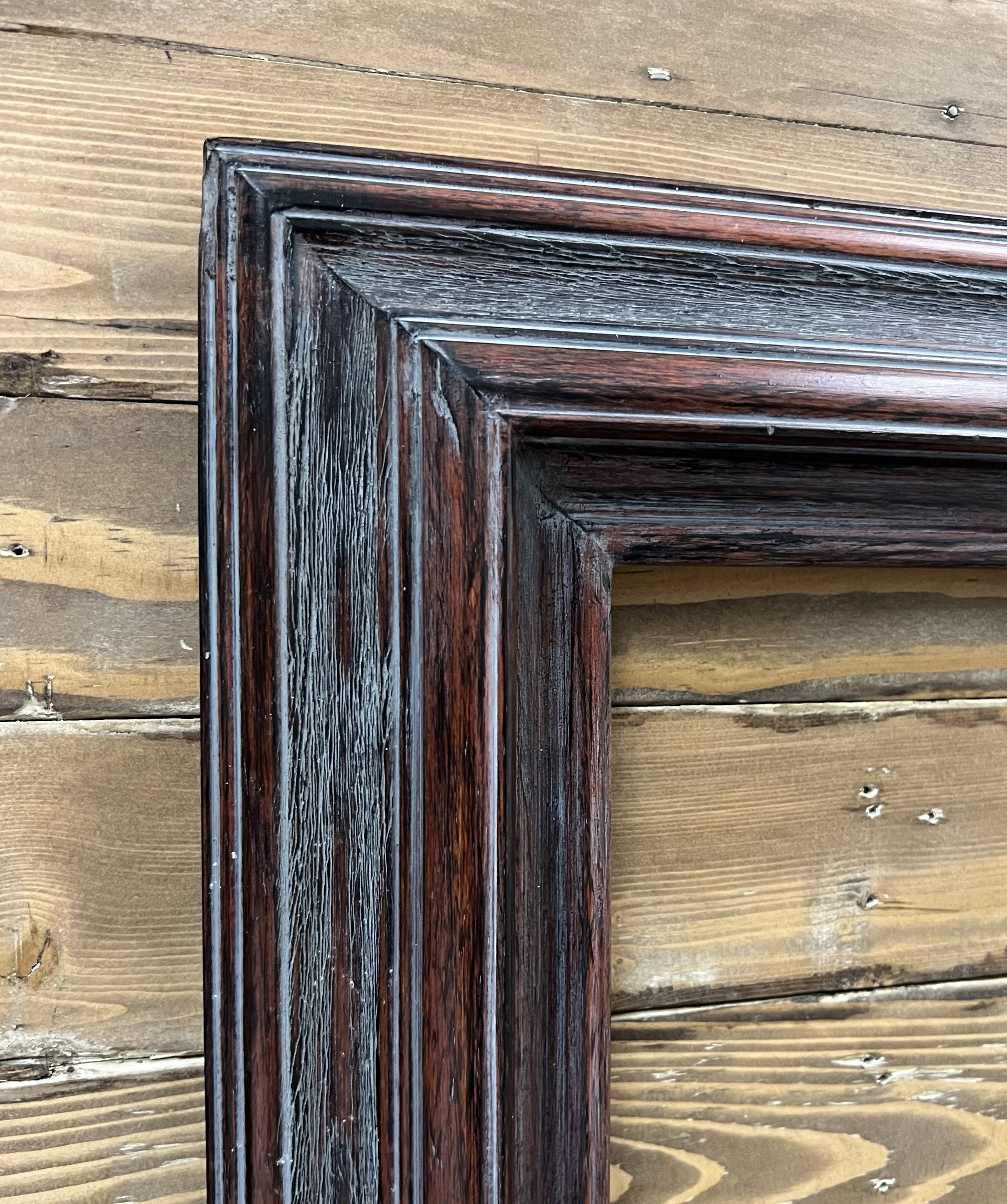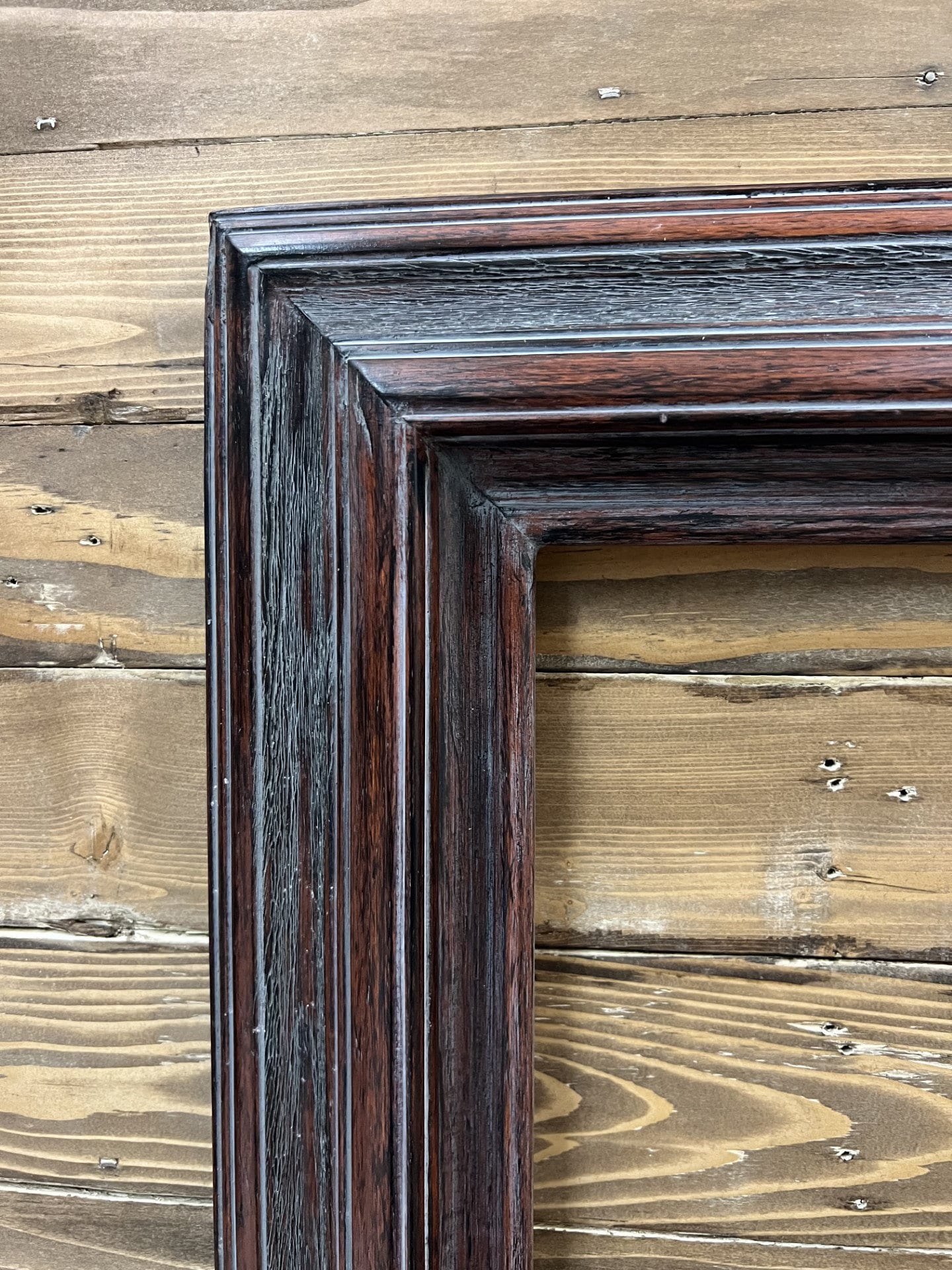 Western style wood picture frame. This two piece solid wood frame is distressed with a timeworn appeal. It is hand painted with a black cherry tone. Great all around frames for any rustic type decor.