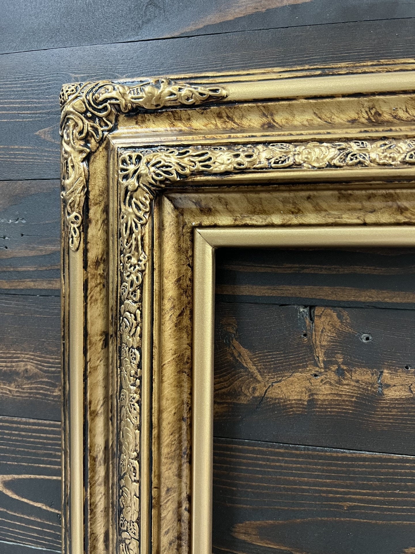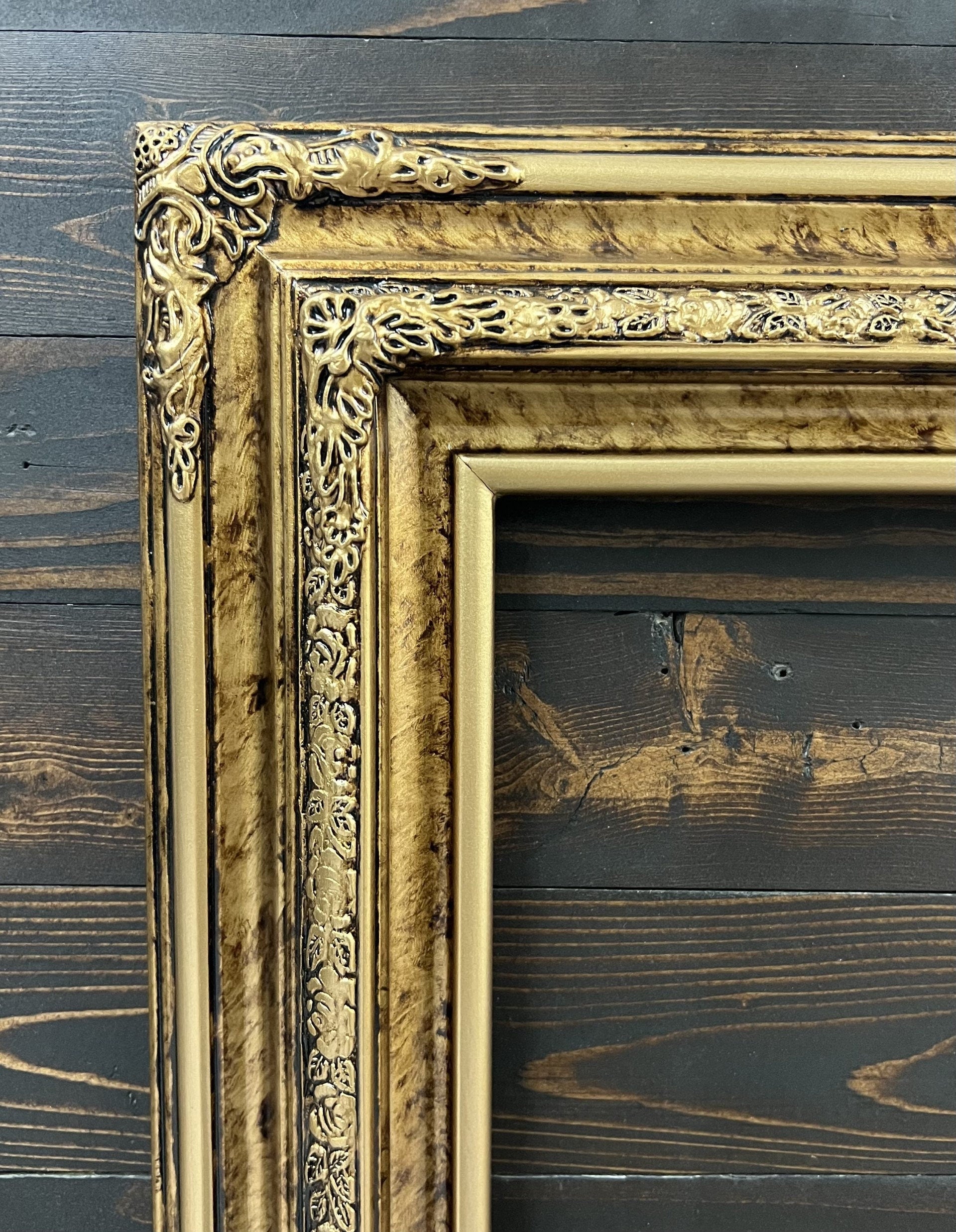 TRADITONAL WOOD PICTURE FRAME WITH COMPO ORNATE CORNERS. THESE ARE TWO PIECE SOLID WOOD FRAMES WITH AN ENGRAVED TRIM AND DECORATIVE FLORAL CORNERS. ALL OF OUR PICTURE FRAMES ARE ASSEMBLED WITH CLOSED CORNERS. WE CUT, JOIN, SAND, AND FINISH IN MANY UNIQUE TECHNIQUES.