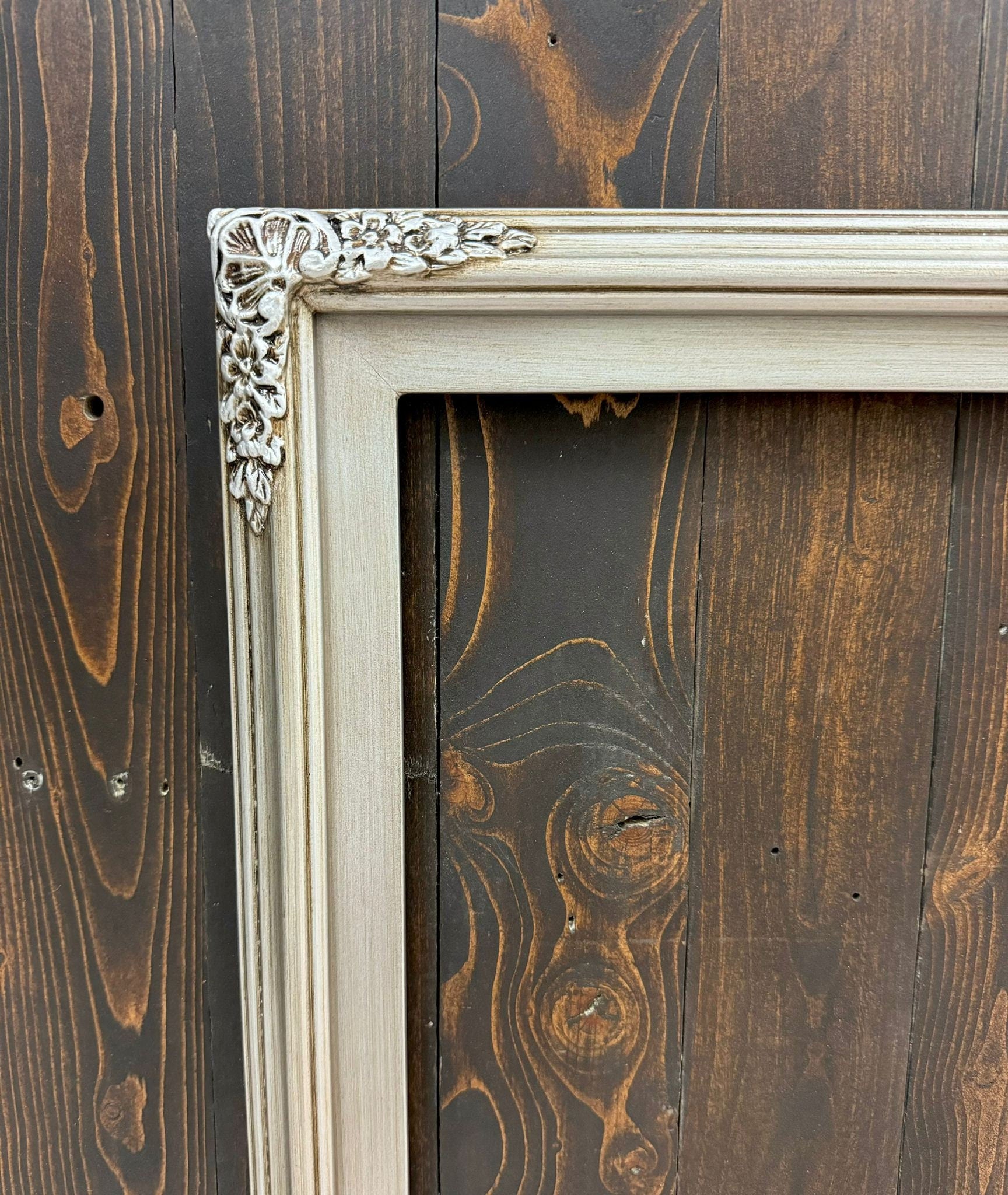 THE FRAME IS HAND PAINTED WITH AN ANTIQUED SILVER FINISH.
