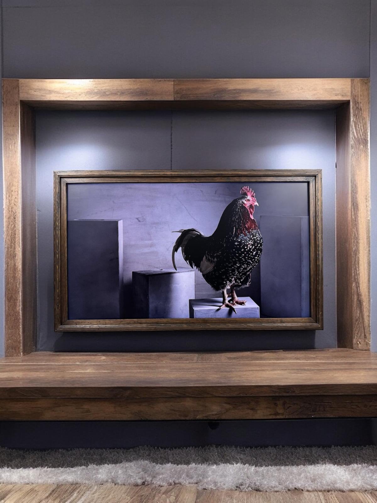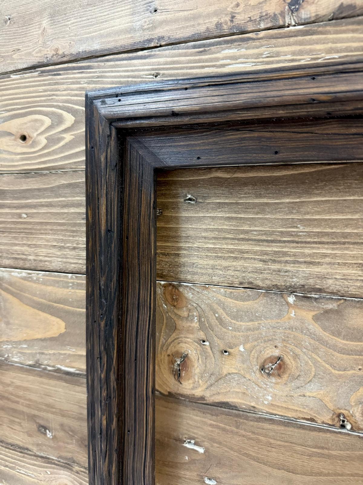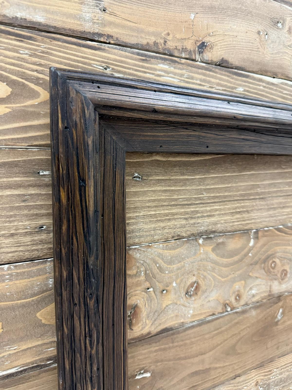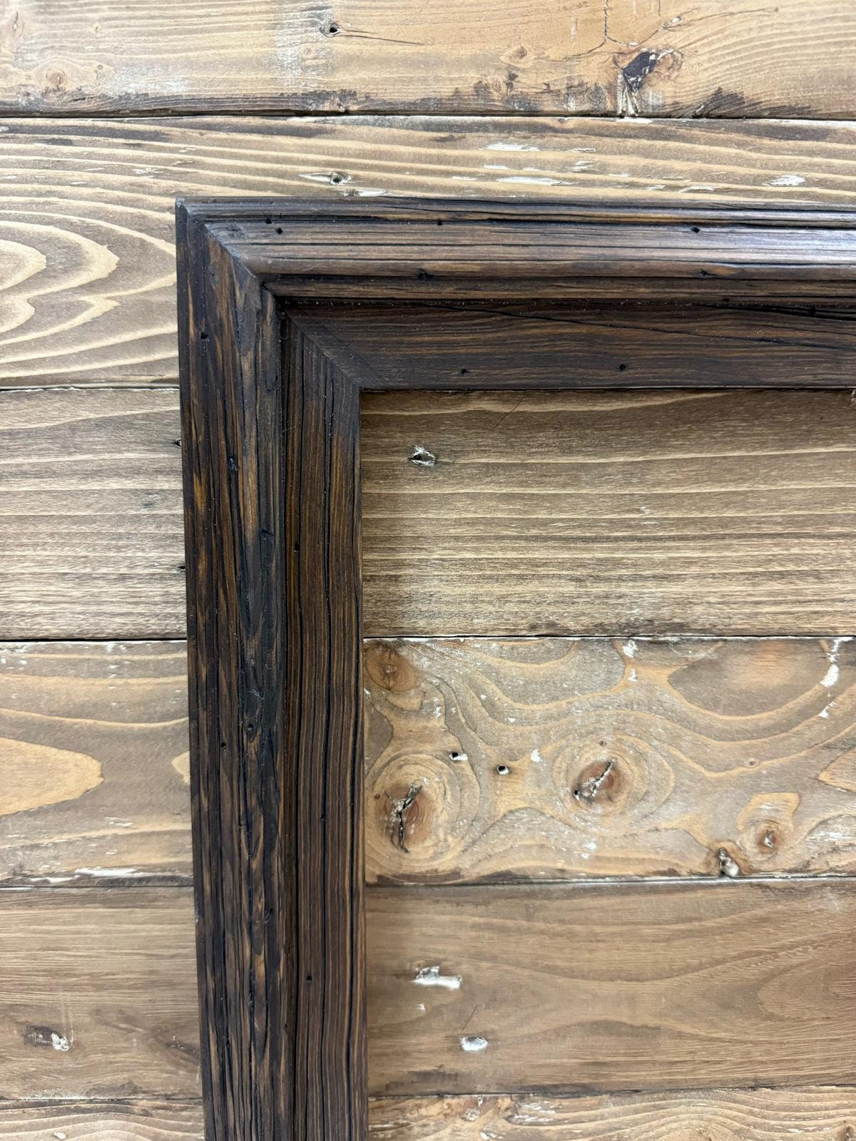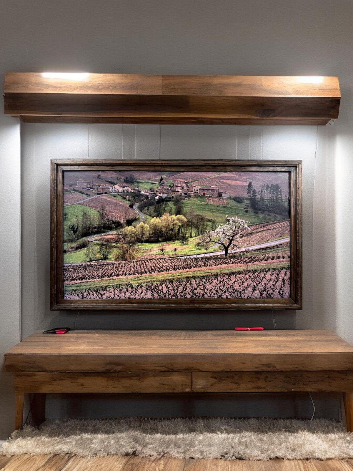 Handcrafted rustic dark wood tv frame.