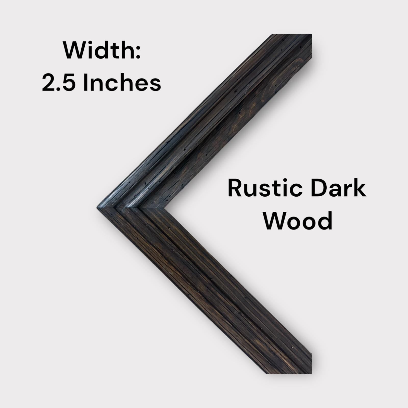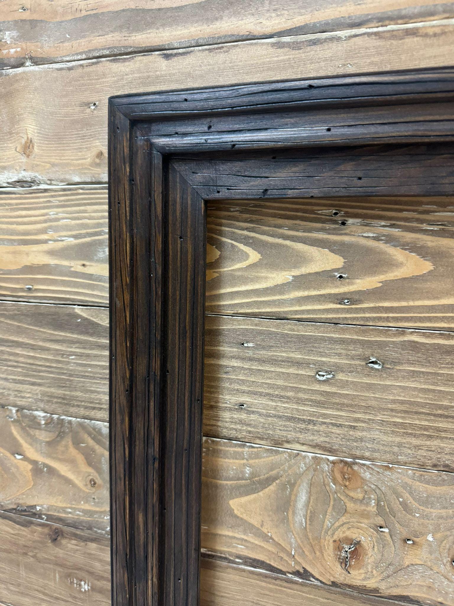 THE FRAME IS HAND DISTRESSED AND STAINED WITH A RUSTIC DARK WOOD FINISH.