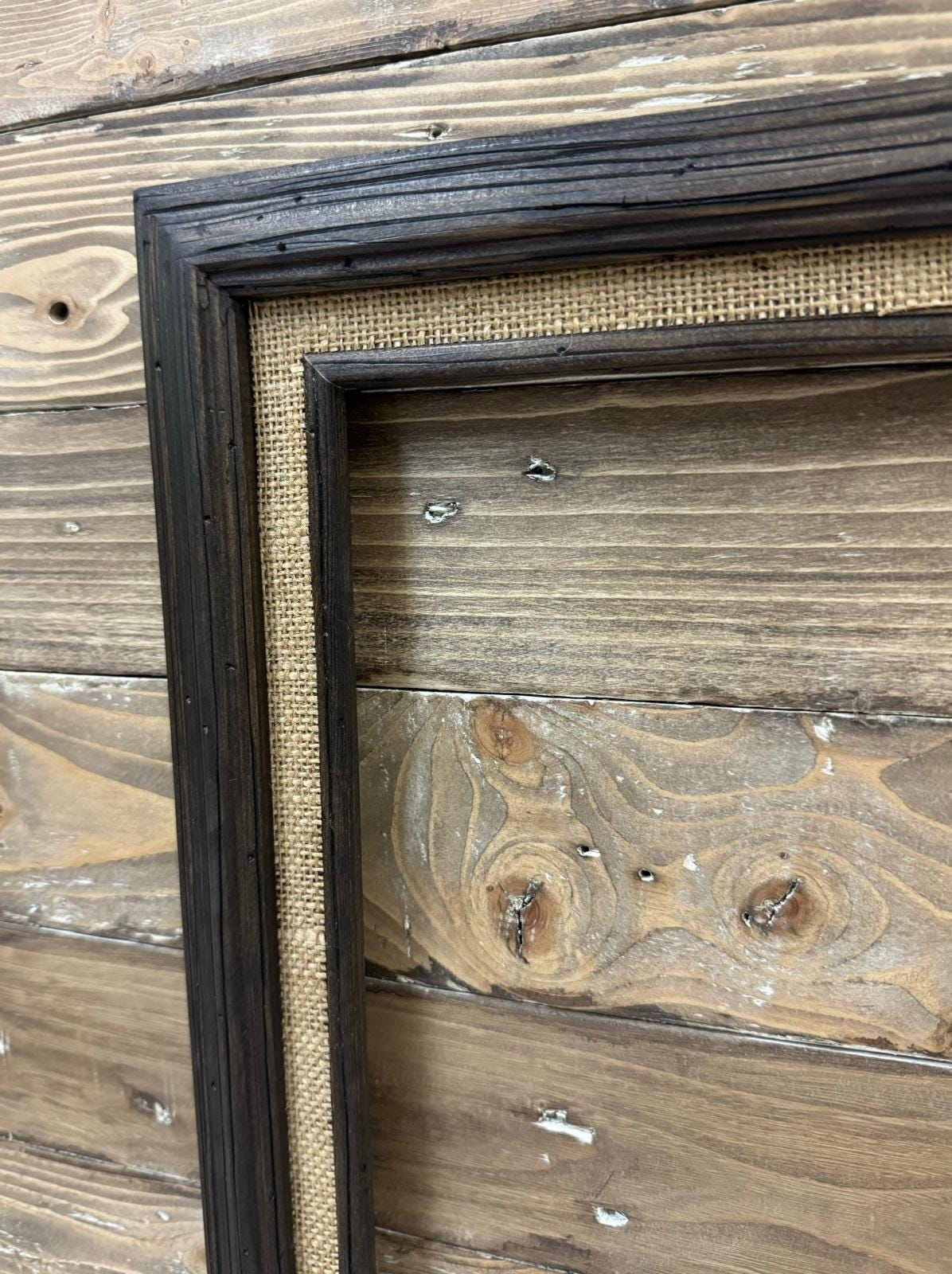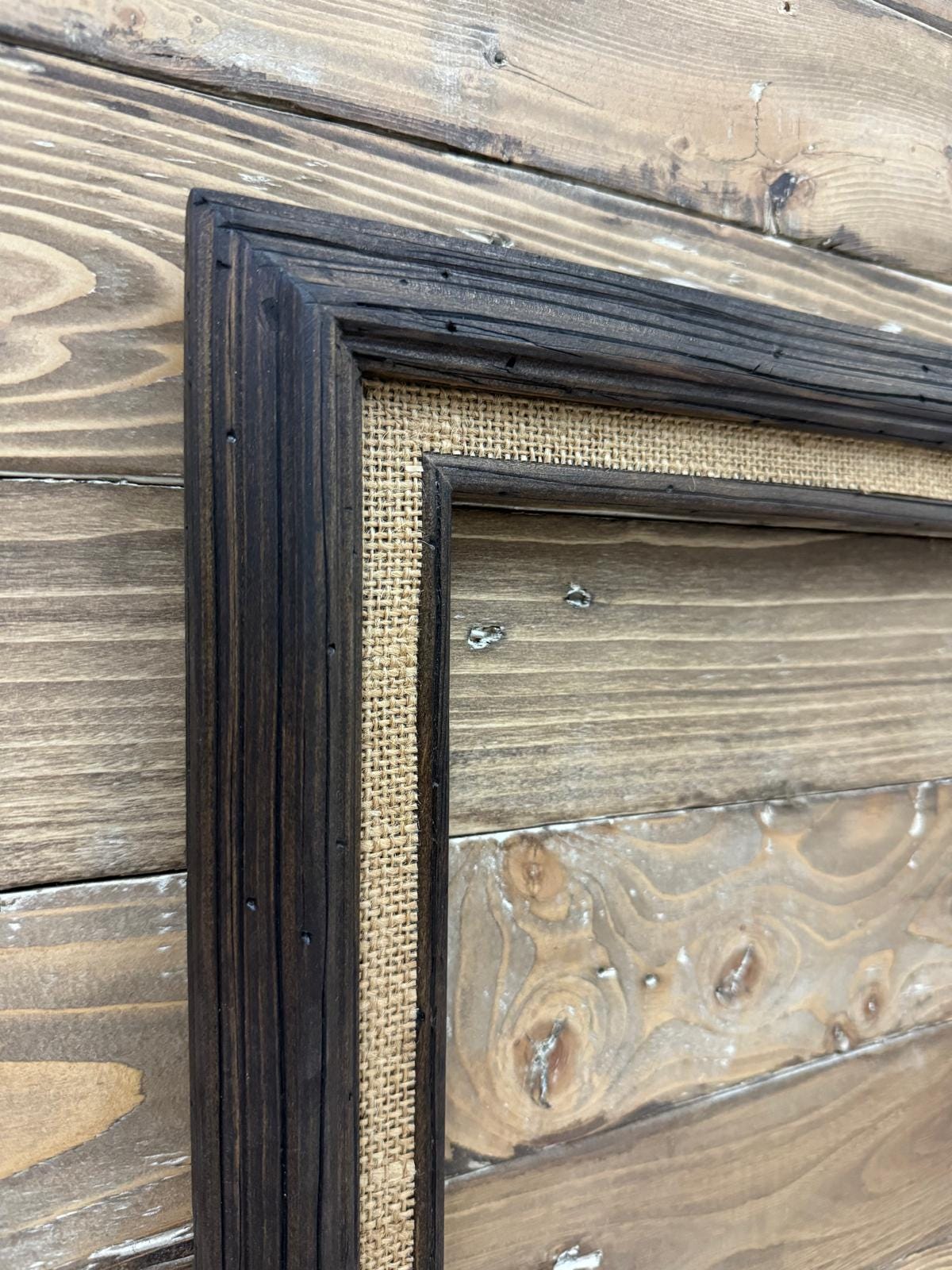 THE FRAME IS HAND STAINED IN A DARK WOOD FINISH WITH A BURLAP FABRIC LINER. PLEASE KEEP IN MIND THESE ARE MADE FROM REAL WOOD AND SOME SLIGHT VARIATIONS MAY EXIST IN THE WOOD TONES.