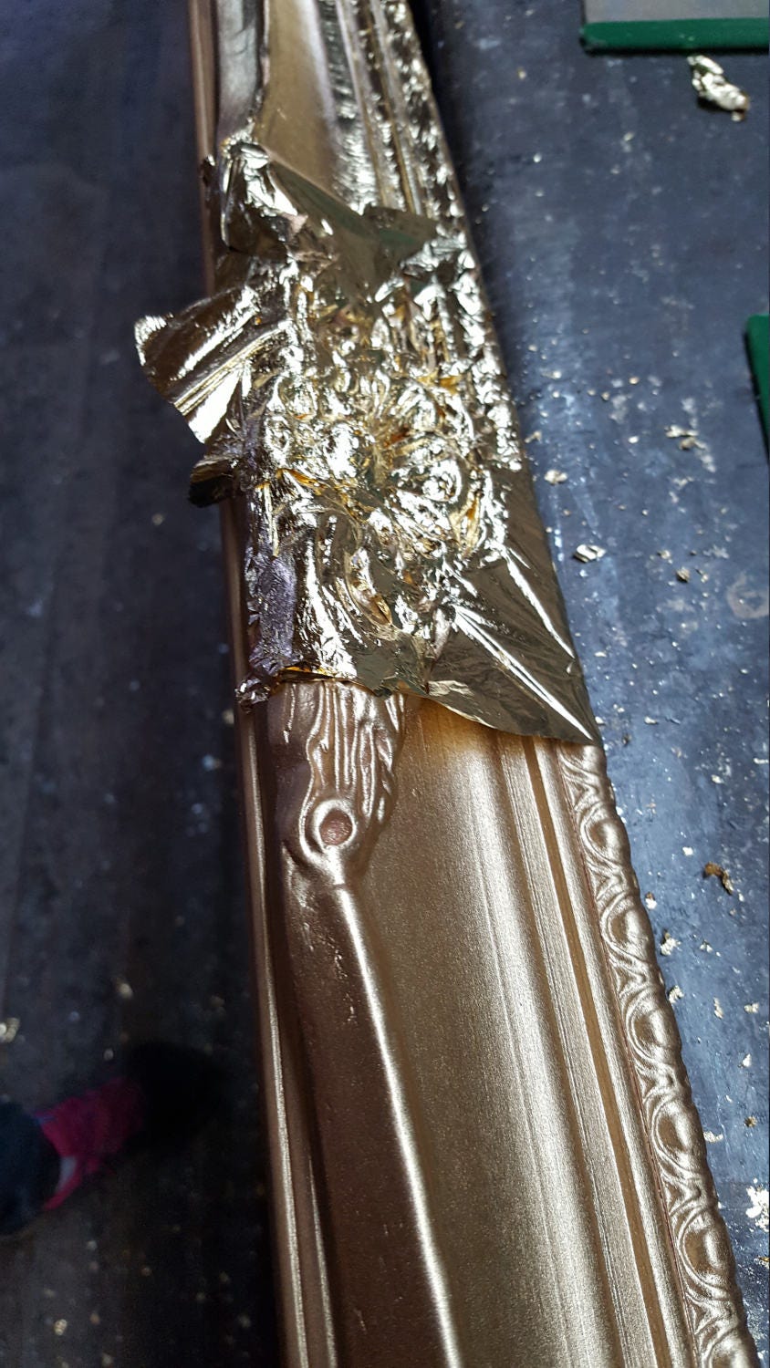 THE FRAME HAS HAND GUILDED GOLD METAL LEAF TO THE COMPLETE FRAME AND FINISHED WITH AN ANTIQUE STYLE PATINA STAIN.