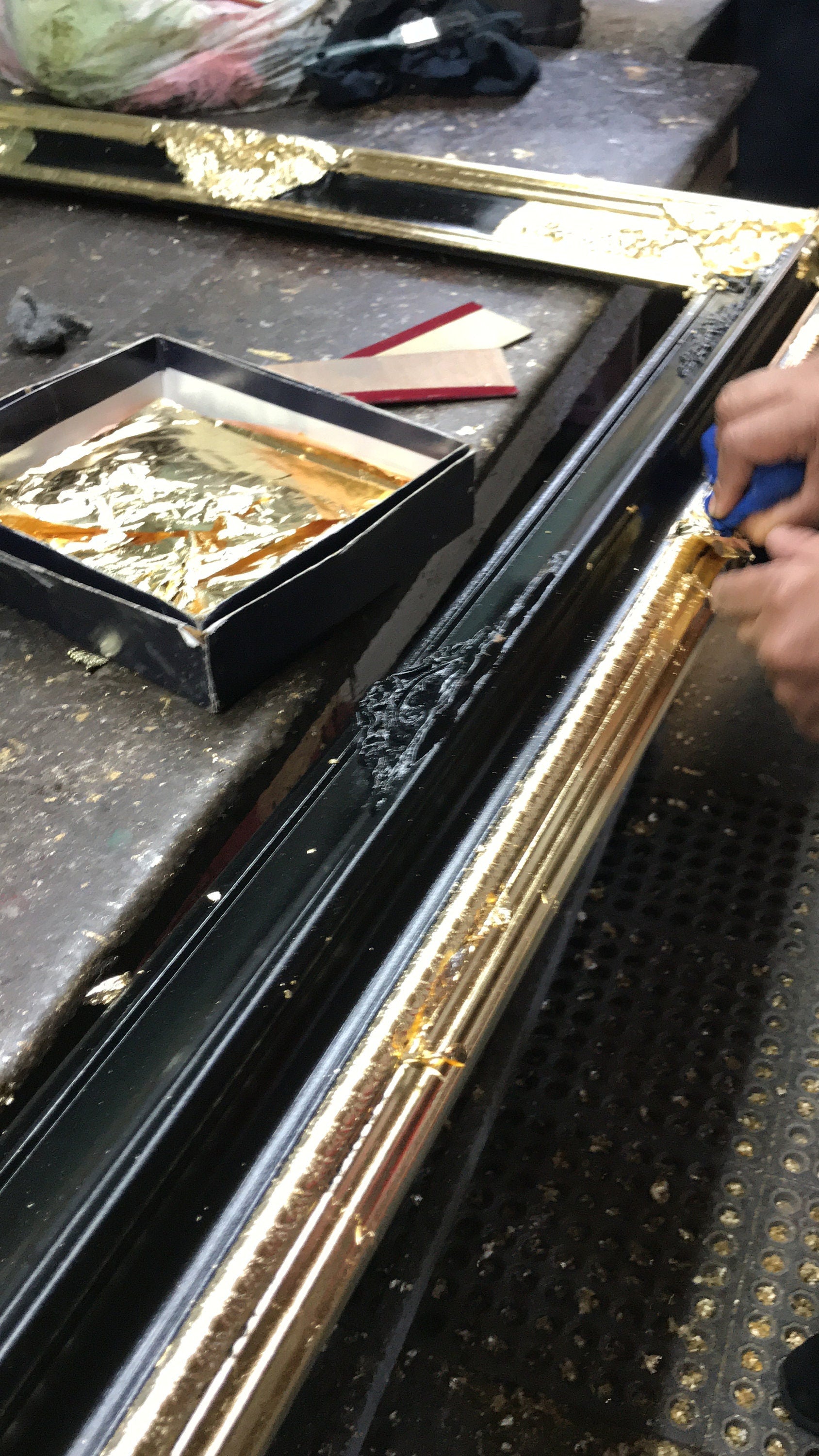 THE FRAME HAS A BLACKBAS WITH GOLD LEAF ACCENTS AND SEMIGLOSS FINISH
