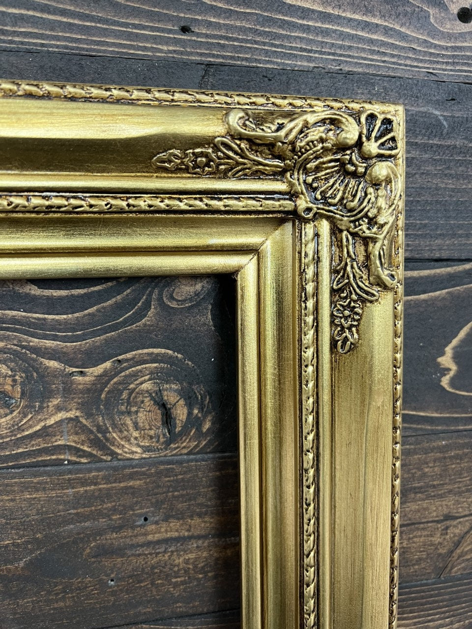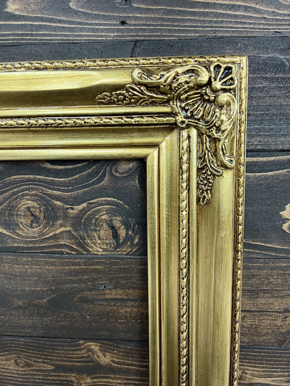 THE FRAME COMES WITH HAND GUILDED GOLD METAL LEAF TO THE COMPLETE FRAME WITH A LIGHT PATINA STAIN.