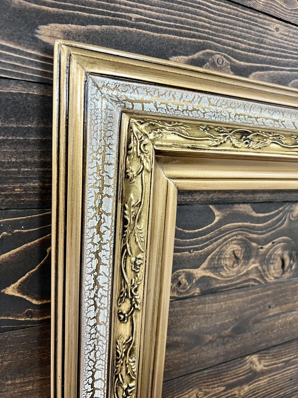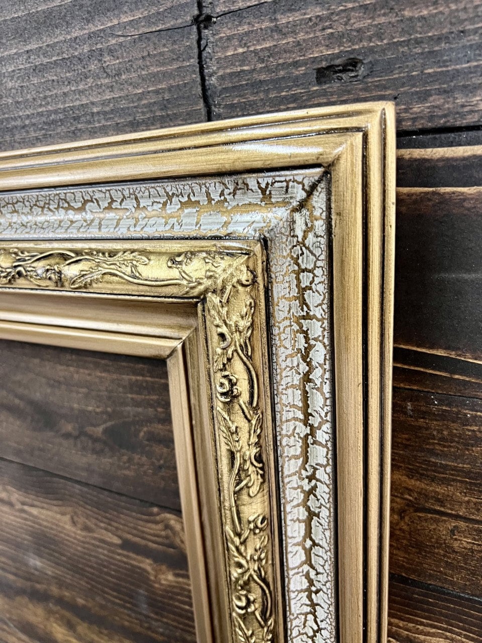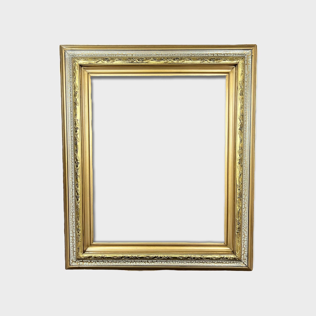 THIS FRAME HAS A GOLD TONE BASE AND FINISHED WITH A HAND DISTRESSED CRACKLE FINISH. GOLD METAL LEAF IS HAND GUILDED TO THE DECORATIVE TRIM.