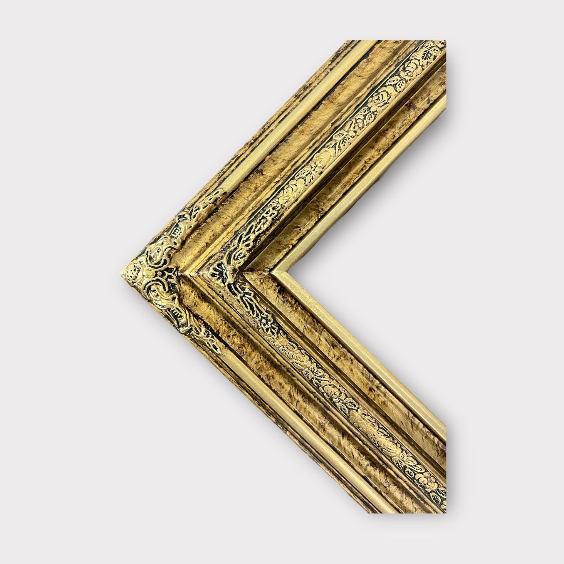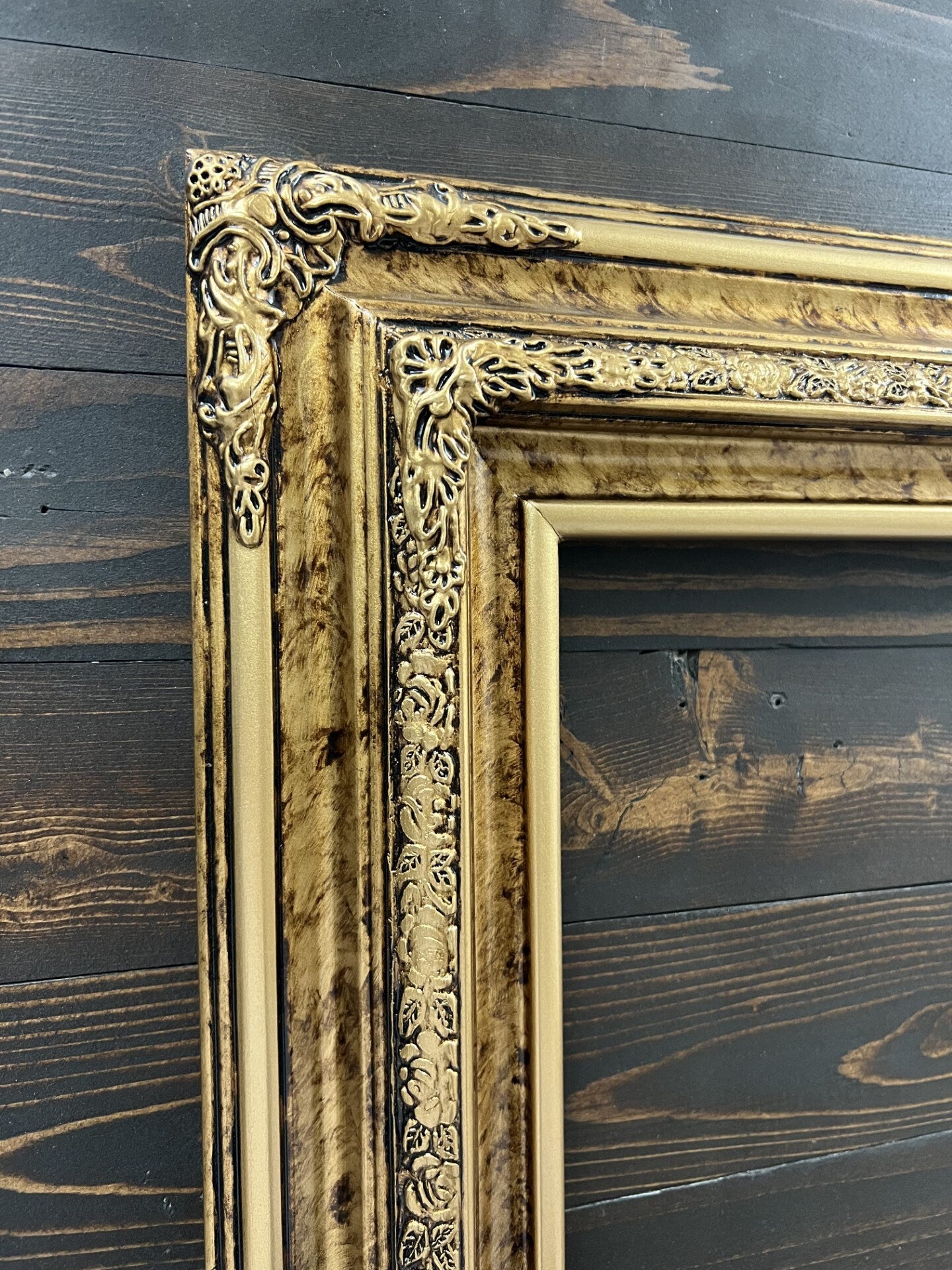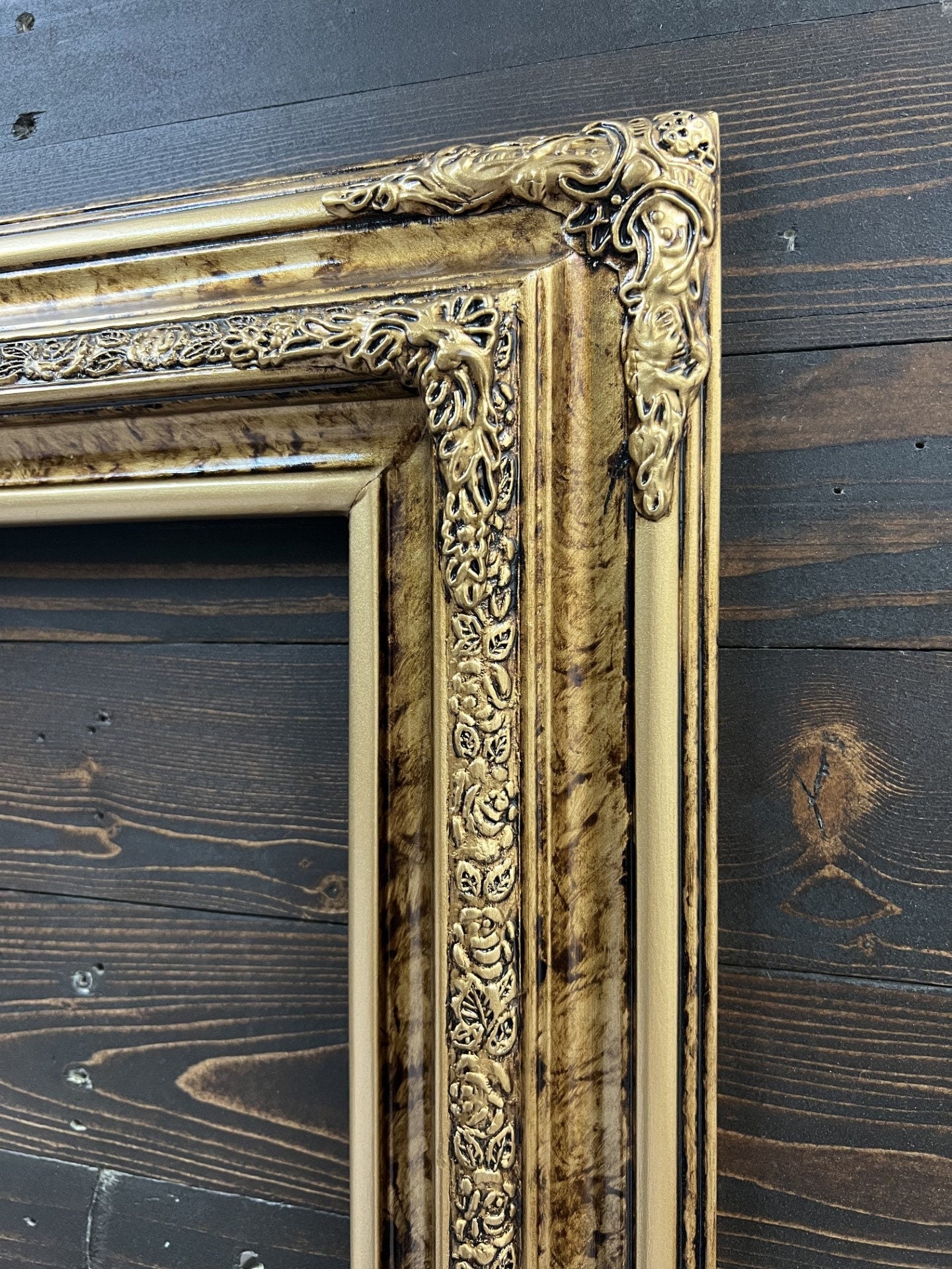 TRADITONAL WOOD PICTURE FRAME WITH COMPO ORNATE CORNERS. THESE ARE TWO PIECE SOLID WOOD FRAMES WITH AN ENGRAVED TRIM AND DECORATIVE FLORAL CORNERS. ALL OF OUR PICTURE FRAMES ARE ASSEMBLED WITH CLOSED CORNERS. WE CUT, JOIN, SAND, AND FINISH IN MANY UNIQUE TECHNIQUES.