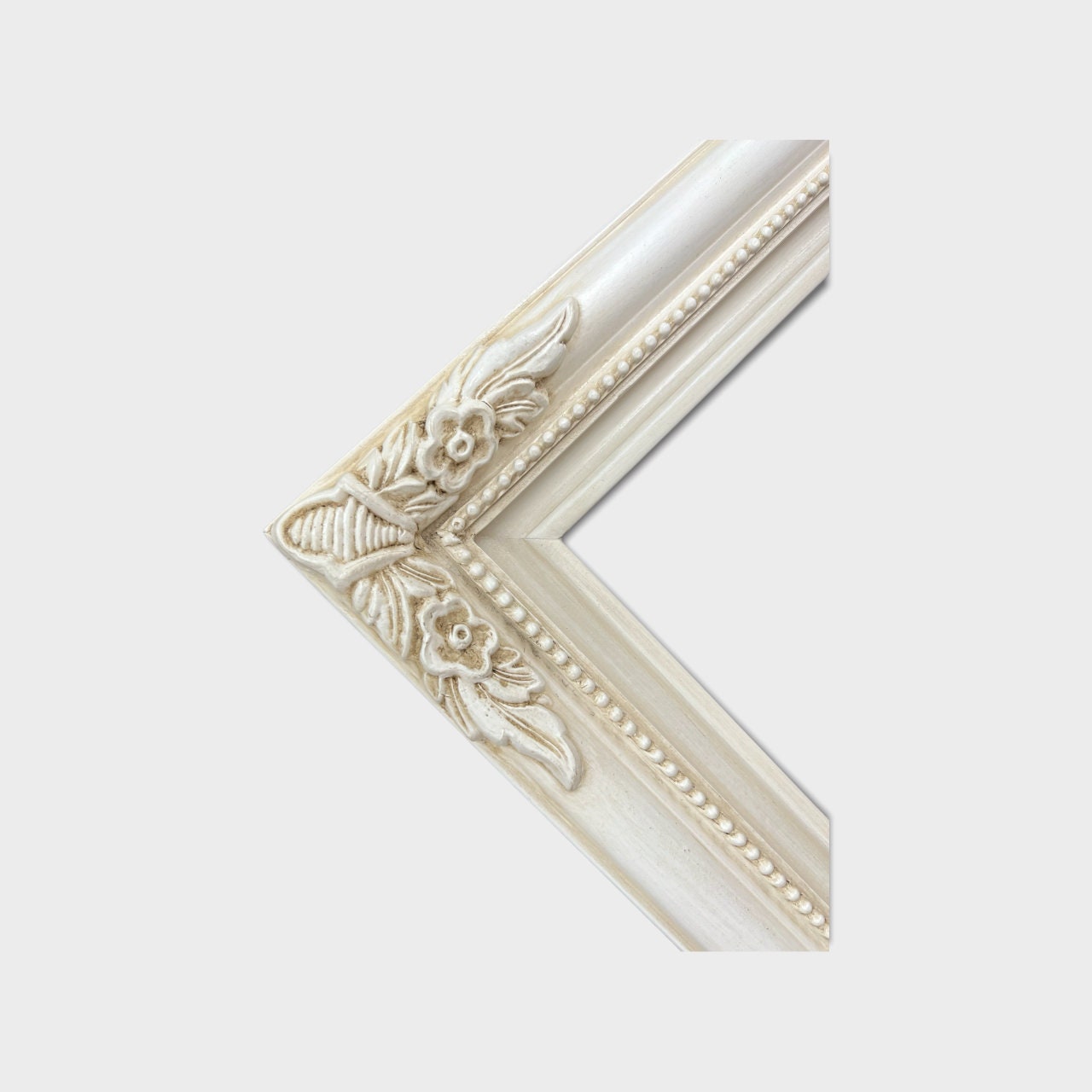 TRADITONAL FRENCH STYLE ORNATE WOOD FRAME. THESE ARE TWO PIECE SOLID WOOD FRAMES WITH A DECORATIVE PEARL TYPE ORNATE TRIM AND BEAUTIFUL DETAILED ORNATE CORNERS. ALL OF OUR PICTURE FRAMES ARE ASSEMBLED WITH CLOSED CORNERS. WE CUT, JOIN, SAND, AND FINISH IN MANY UNIQUE TECHNIQUES.